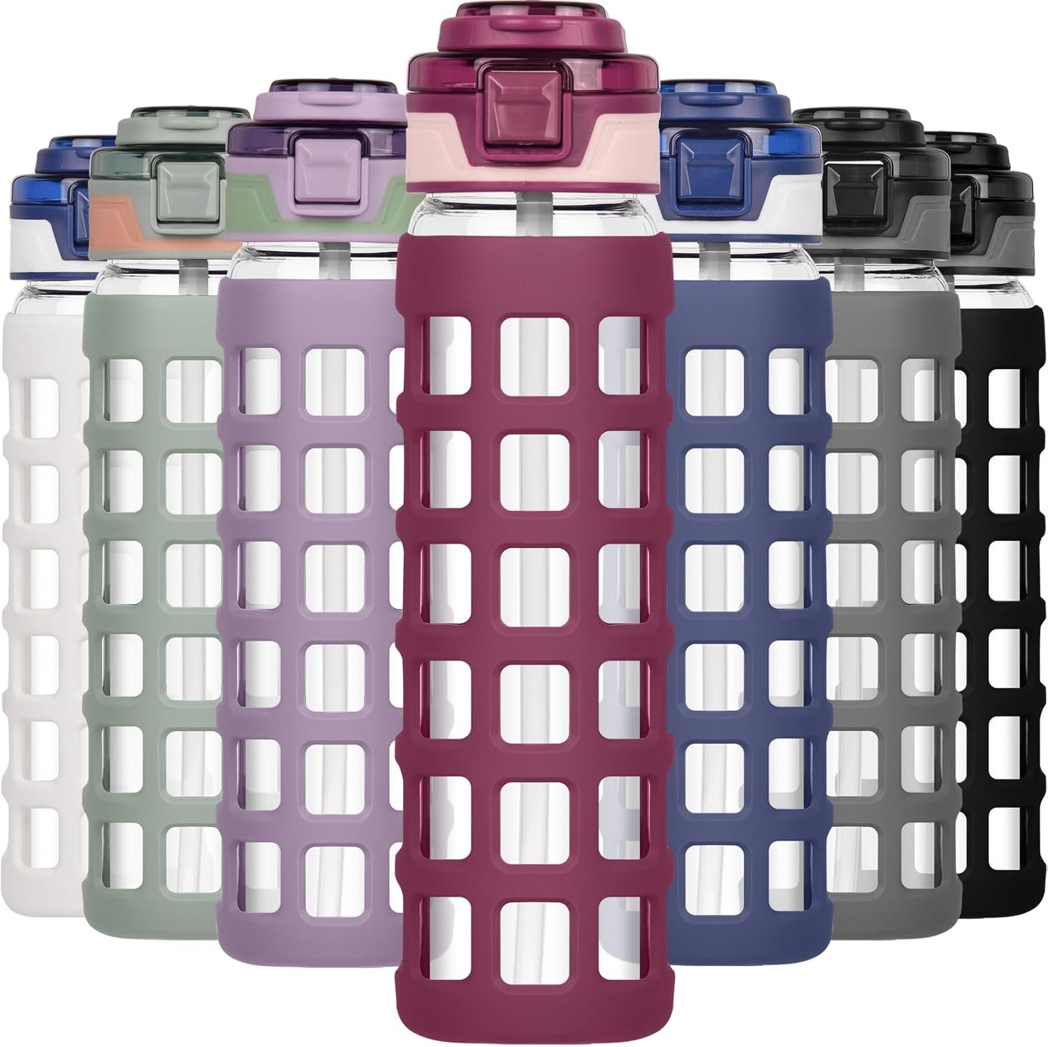 From Ferexer MULTIPLE CAPACITIES & EASY DRINK – Ferexer Glass Water Bottle 32oz/22oz, there are various capacities available for selection., 32oz size: H:11.8in W:3.07in, 22oz size: H:10.63in W:2.76in. Glass drinking bottles with foldable straw cover & carry handle for easy carry. Features built – in pop – up straw for convenient drinking. BOROSILICATE GLASS & BPA FREE – This glass water bottle is made of BPA free borosilicate glass. It is sturdy and durable, resistant to impacts, and will not affect the quality of the water. It can meet the needs of all daily beverages, and at the same time, it will not compromise the quality of the glass water bottle itself. LEAK-PROOF & SILICONE PROTECTIVE COVER – Glass water bottle has a silicone sealing ring for optimal sealing. The detachable ring can be cleaned anytime to keep it clean and tidy. This glass bottle comes with a silicone protective cover, both stylish and protective. VARIOUS USAGE SCENARIOS – This glass sports water bottle is suitable for various usage scenarios, ranging from home and the office to the gym, and even for outdoor activities. It is a practical and thoughtful gift for relatives and friends who pay attention to their health and drinking habits. POST SALE SERVICE – If you have any questions about your order or the water bottle, please feel free to contact us. We will provide you with satisfactory service and answer your concerns.