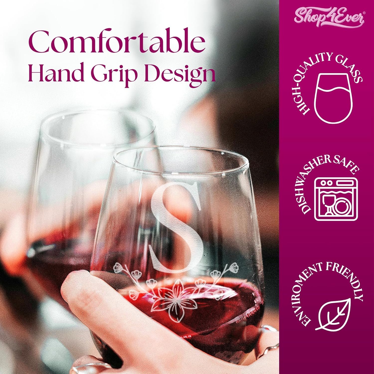 Floral Monogram Engraved S Initial Stemless Wine Glass 15 oz. Personalized Mother’s Day Bridal Gift for Her Elegant Custom Letter Wine Glass