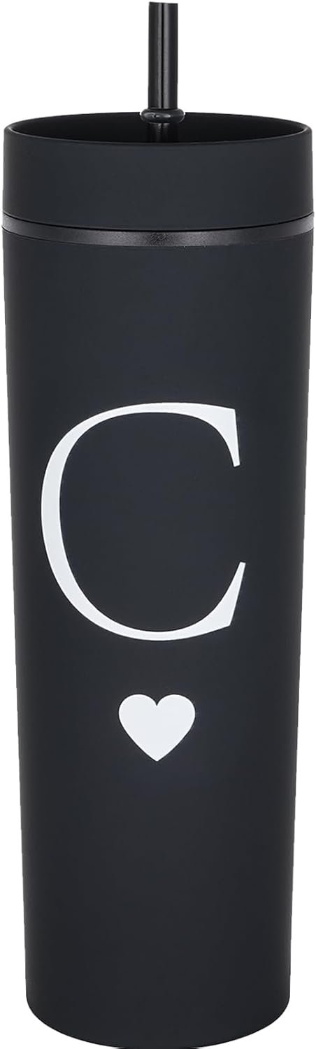 Forest Kiss Letter C Personalized Initial Gifts for Women Men 16oz Double Wall Food-grade Plastic Skinny Tumbler Monogrammed Matte Slim Cup Wedding Graduation Birthday Present (C)