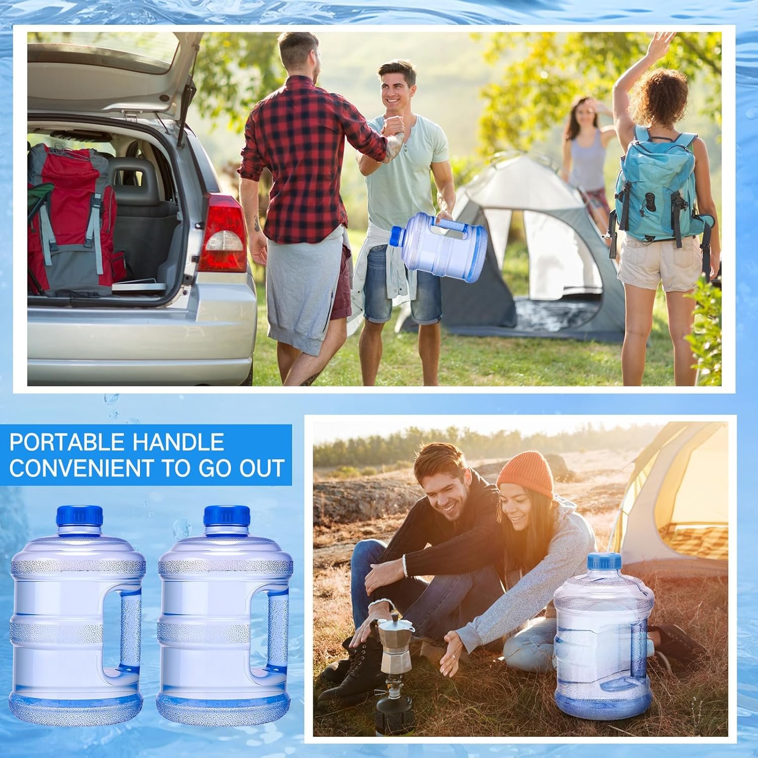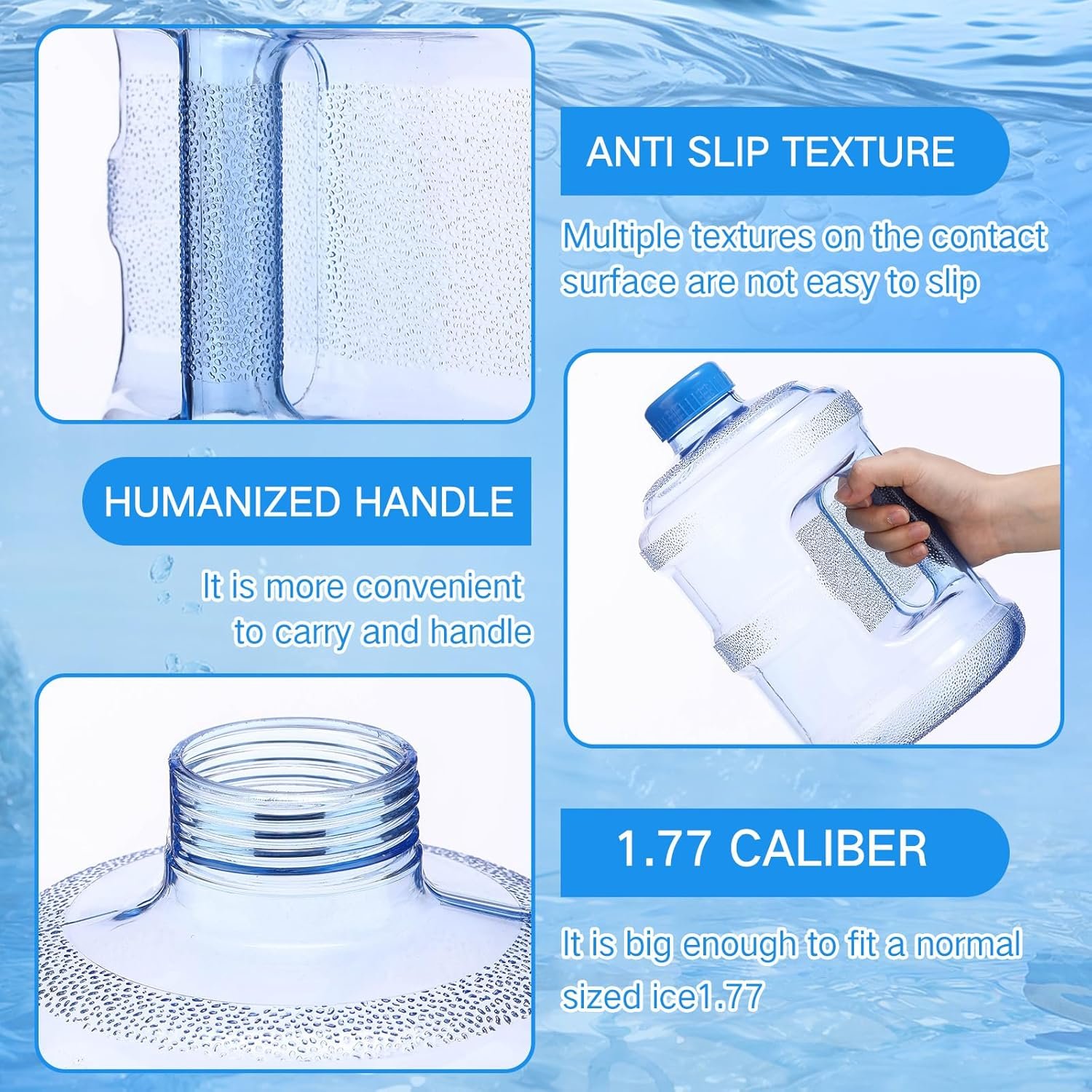 Size and Capacity Information: the plastic water jugs measures 6.6X10.63 inches, the opening diameter of 1.77 inch, wide enough to fill with water and ice; And has a capacity of approximately 1 gallon, nice for 2–3 people, it is an ideal outdoor accessory