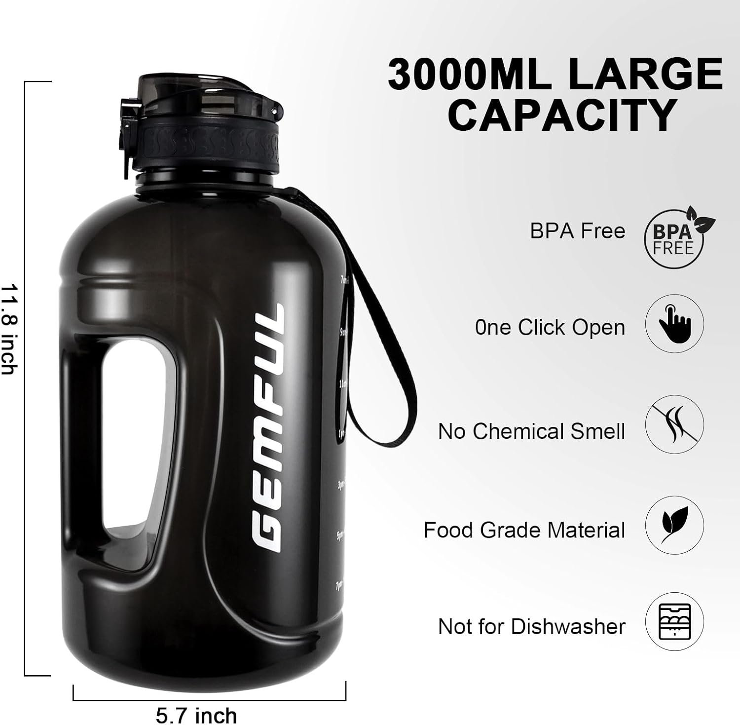 GEMFUL 3L Water Bottle with Straw & Time Marker Motivational Large Water Jug BPA-Free Leakproof Bottle 101oz for Gym Sports Fitness Hiking (Black with Removable Straw)