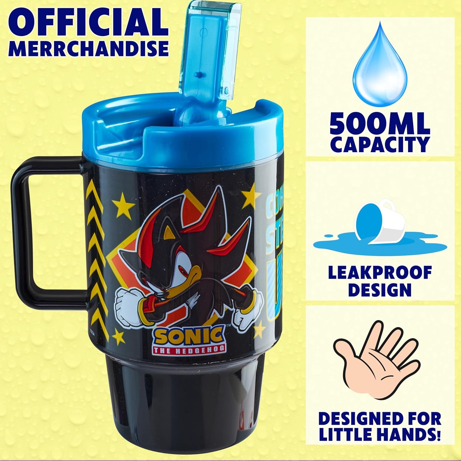 Hydrate on the go with the Sonic the Hedgehog kids water bottle. This 16.9 oz BPA free plastic tumbler features a screw lid, flip sipper, straw insert, and handle. A reusable, leakproof cup designed for gamers for school, sports, travel, and daily hydration.