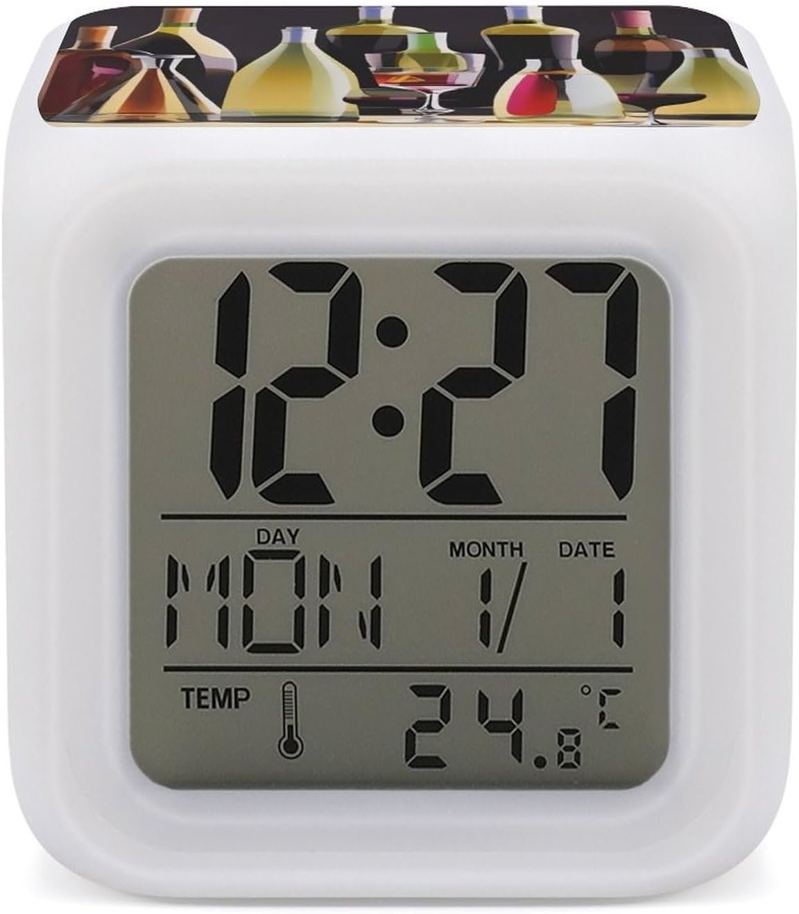 Multi-Function Monitoring: Monitor your bedroom temperature with real-time sensing while tracking date and week displays on this Cocktail Glasses And Wine Bottles digital alarm clock’s comprehensive interface.