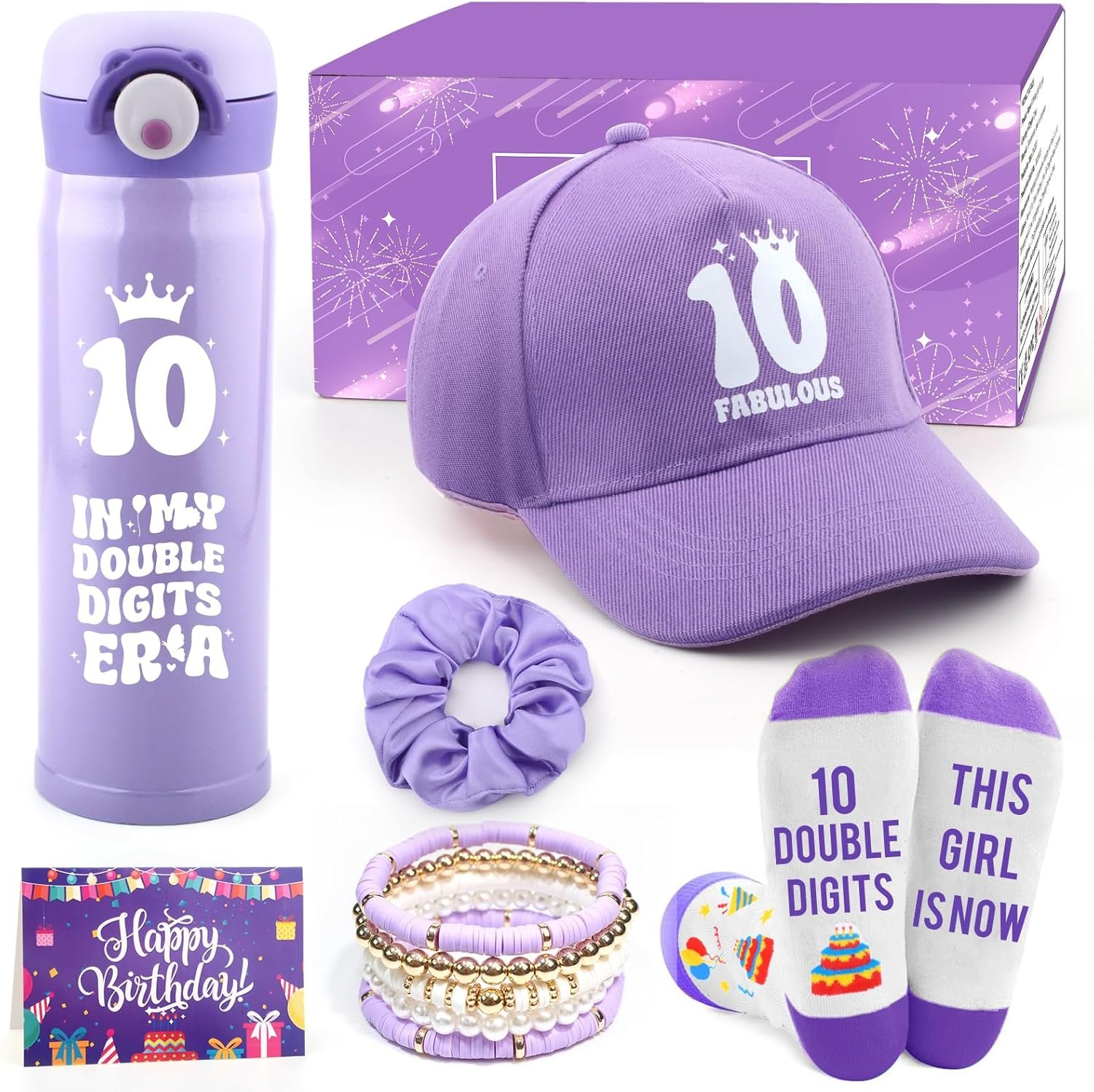【BIRTHDAY GIFT FOR 10 YEAR OLD GIRL WITH SURPRISES】 The 10 year old girl birthday gifts set contains 6 pieces! 1x purple stainless steel woter bottle with “IN MY DOUBLE DIGITS ERA” printed on it, 1x personalised baseball cap, 1x creative bracelet (5 in total, 1 gold, 2 white, 2 purple), 1x soft and cosy socks, 1x cute purple hair band, 1x thoughtful birthday card! Each gift represents your love and sincere wishes for your girl.(All gifts in a purple gift box)