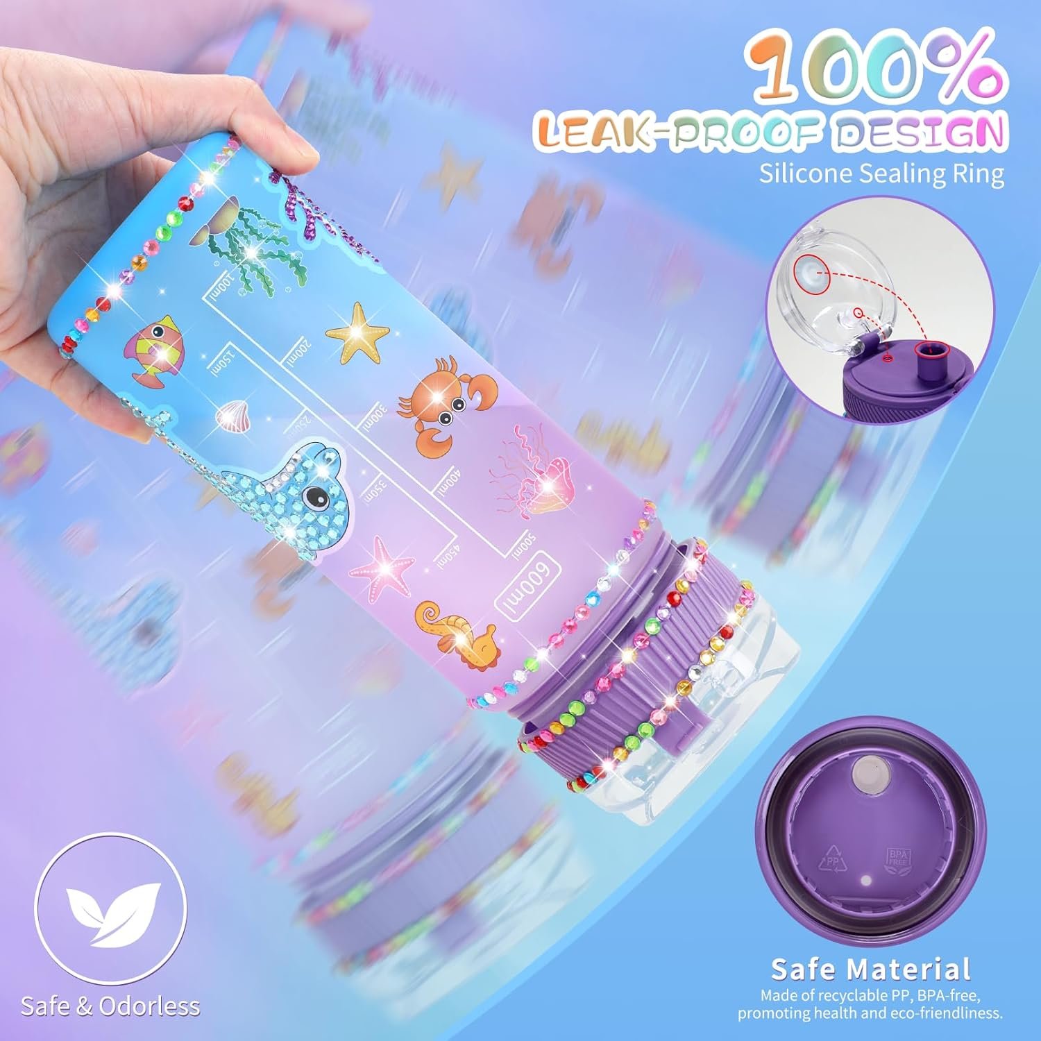 💝 𝐈𝐝𝐞𝐚𝐥 𝐆𝐢𝐟𝐭: Our BPA-free DIY water drink bottle, featuring capacity markings, comes with a delightful selection of diamond and unicorn stickers, all beautifully packaged. Perfect for daughters, granddaughters, and girls aged 6-12, it’s an ideal gift for activities like running, traveling, school, camping, picnics, and both indoor and outdoor sports.