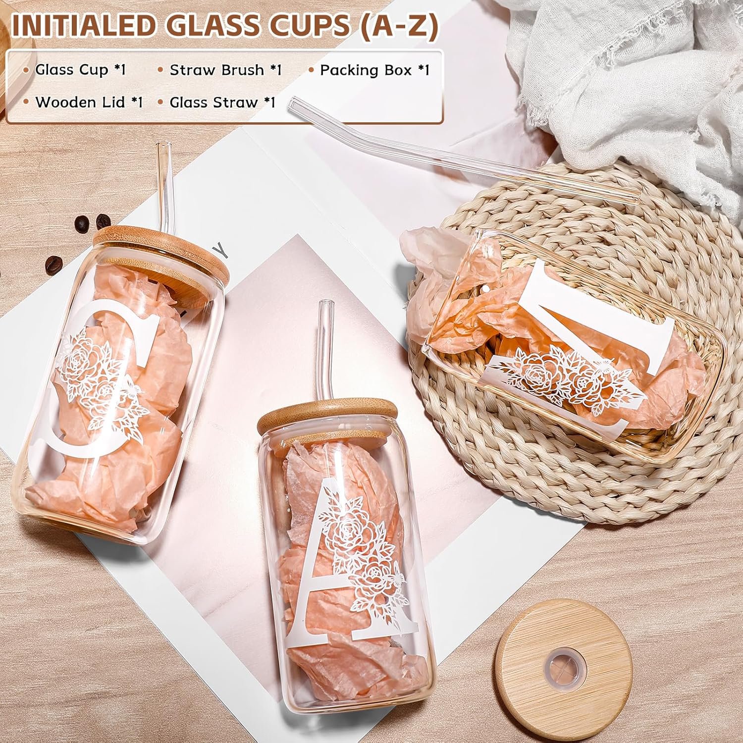 Elegant Gift Packaging:Monogrammed glass cup with lid comes in a sleek,gift-friendly box,no extra wrapping needed,hand wash recommended printed monogrammed gifts for women to protect personalized tumbler;after cleaning the lid,be sure to keep it dry