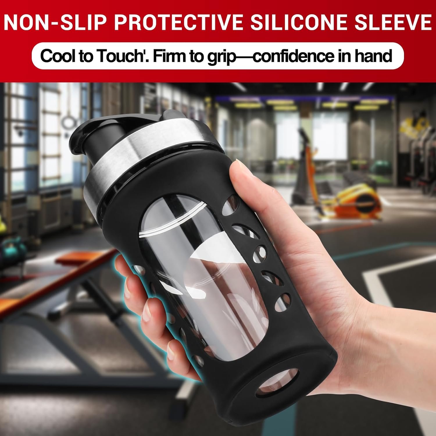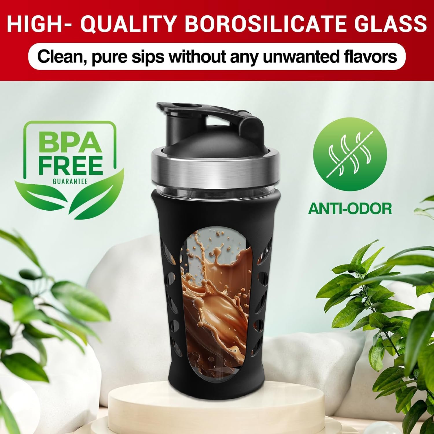 Glass Protein Shaker Bottle for Protein Mixes and Shakes – 635ml 20oz, BPA-Free Shake Bottle, Leak-Proof Glass Shaker Blender – Mixer for Gym, Durable Shaker