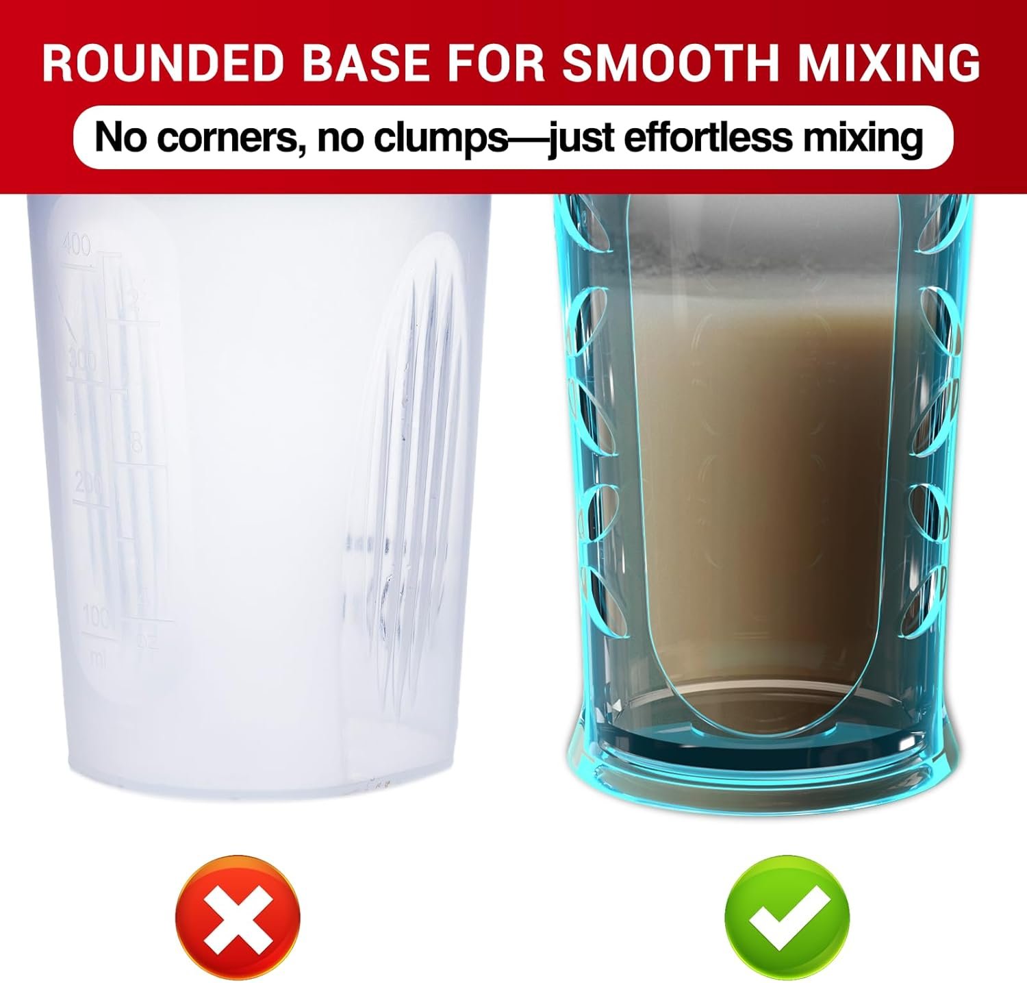 STAINLESS STEEL INSERT & ROUNDED BASE FOR SMOOTH MIXING: Designed for effortless blending, this protein powder shaker bottle or workout bottle features a 304 stainless steel insert or shaker bottle ball that flawlessly mixes protein powder for a smooth, lump-free texture. The rounded base of the protein shaker cup or gym shaker bottle prevents residue from sticking, ensuring complete mixing with no waste.