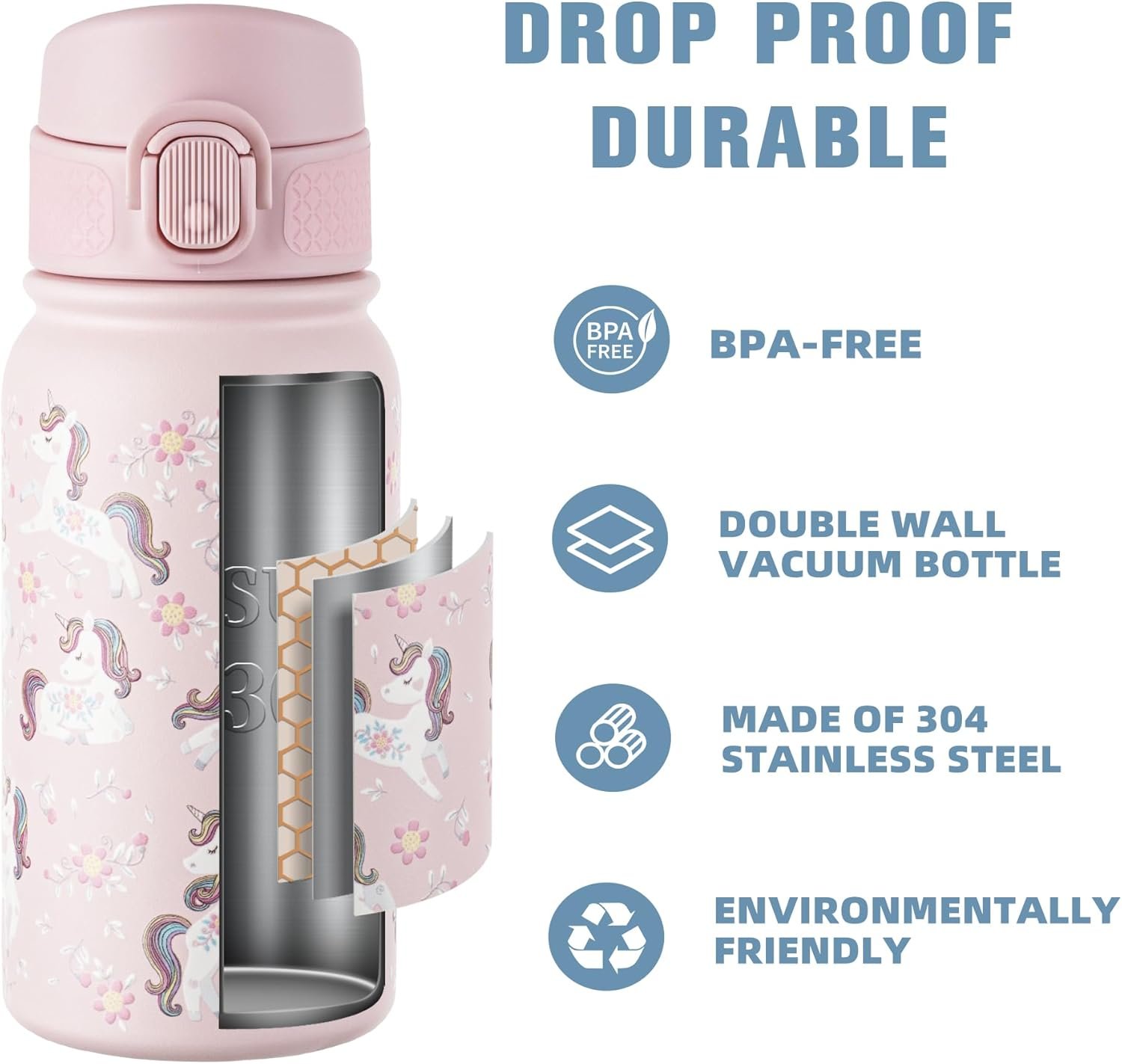 The insulated water bottle – The stainless steel insulated water bottle is designed for children and can keep liquids hot for 12 hours and cold for 24 hours. Our children’s insulated water bottles are made of 304 stainless steel, free of bisphenol a and odorless