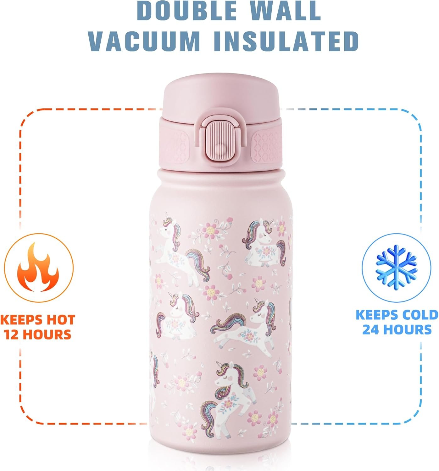 GOPPUS 12 oz Kids Water Bottle – Stainless Steel Insulated Water Bottle, BPA Free, Odorless, Durable and Reusable for School, Sports and Outdoor Activities(Pink Unicorn)