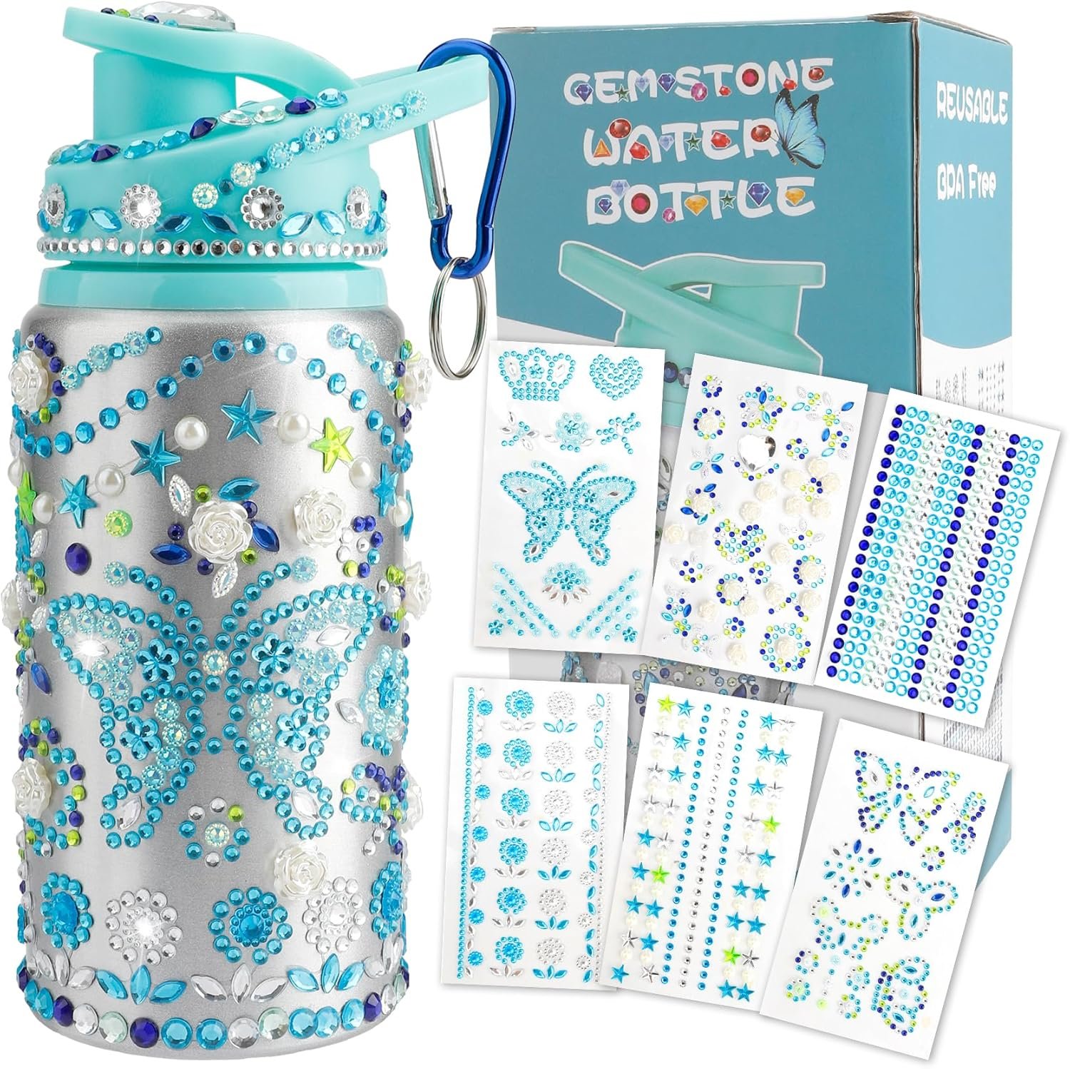 Package Includes: 1 X Water bottle, 1 X Carabiner, 6 X Diamond Stickers
