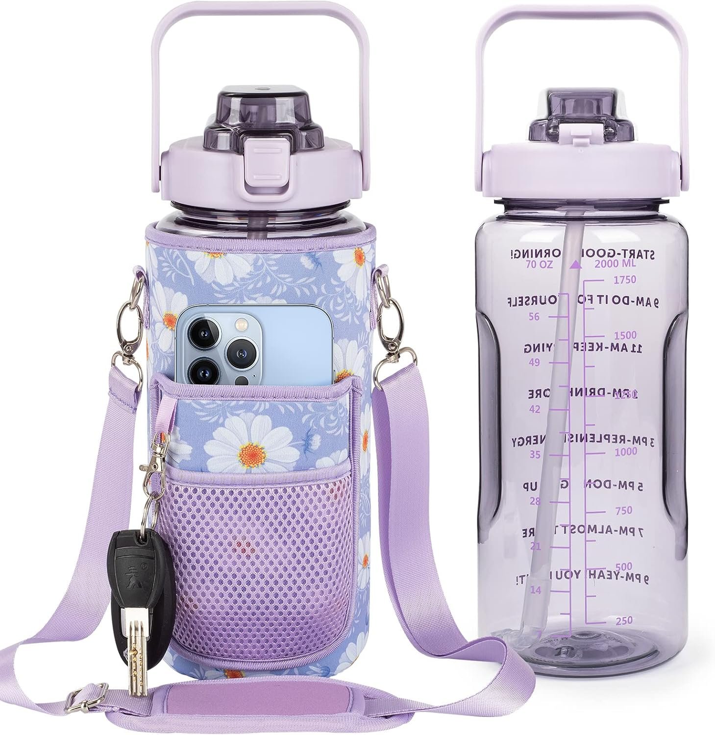 INSULATED STORAGE SLEEVE DESIGNS: Multifunction Half Gallon Water Jug With Sleeve, which protects the water bottle from slip and fall. Unique Storage Sleeve Design that holds your cards and cell phone, keychain, and is finished with removable shoulder strap for convenient hands-free carrying!