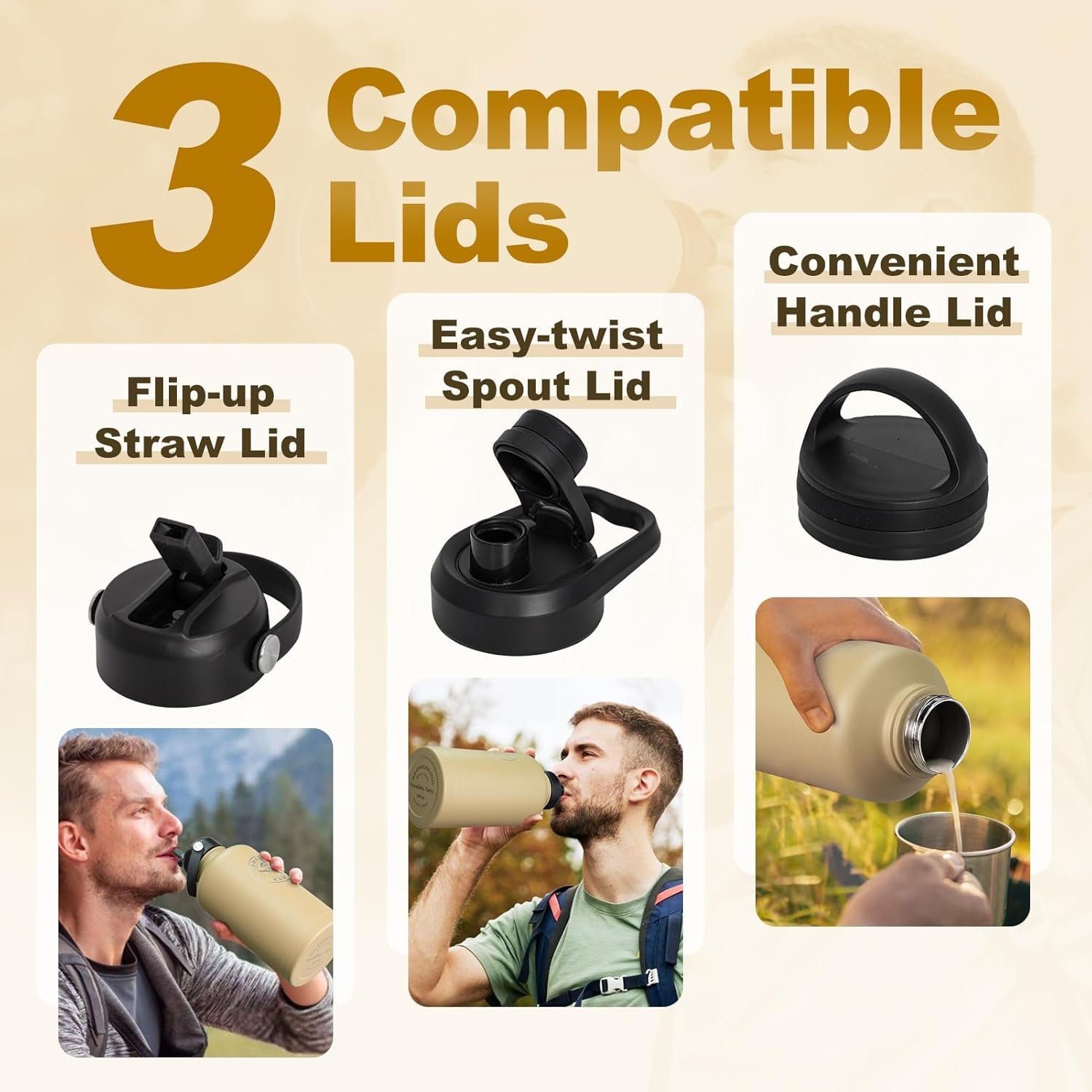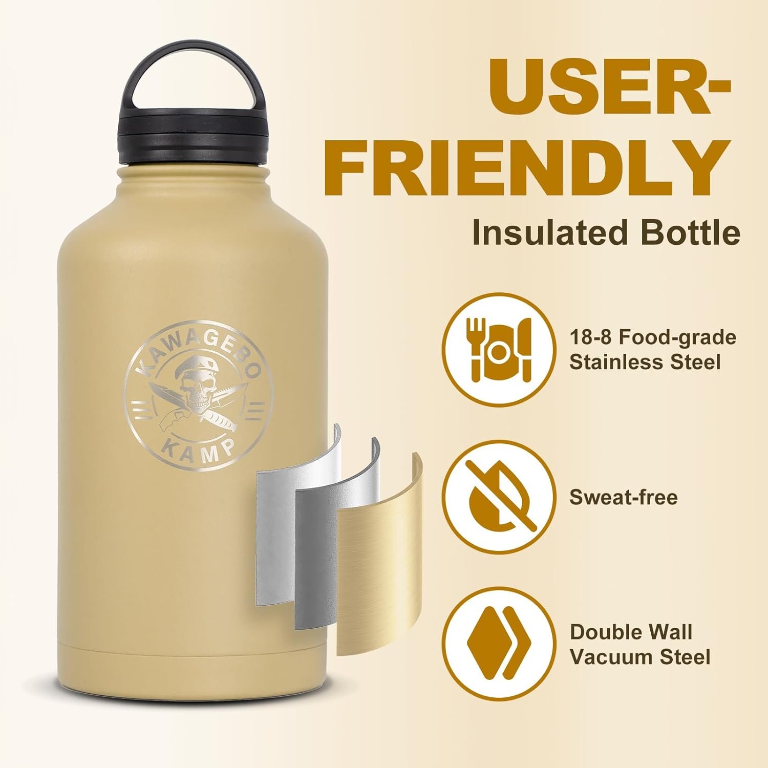 Half Gallon Water Bottle with Straw – 64 oz Stainless Steel Insulated Water Jug, Sport Bottle with 3 BPA Free Lids, Paracord Handle, Strap, Molle System for Outdoor Gym Hiking – Khaki
