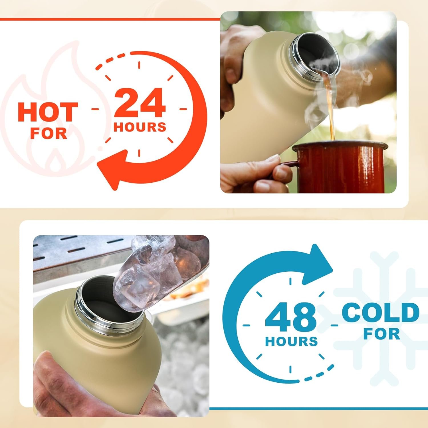 Insulated design: The 64oz insulated water bottle with double wall vacuum insulation keeps your drinks at the right temperature all day long, providing cool ice water 48 hours on hot summer days and heart-warming hot water 12 hours on colder days.