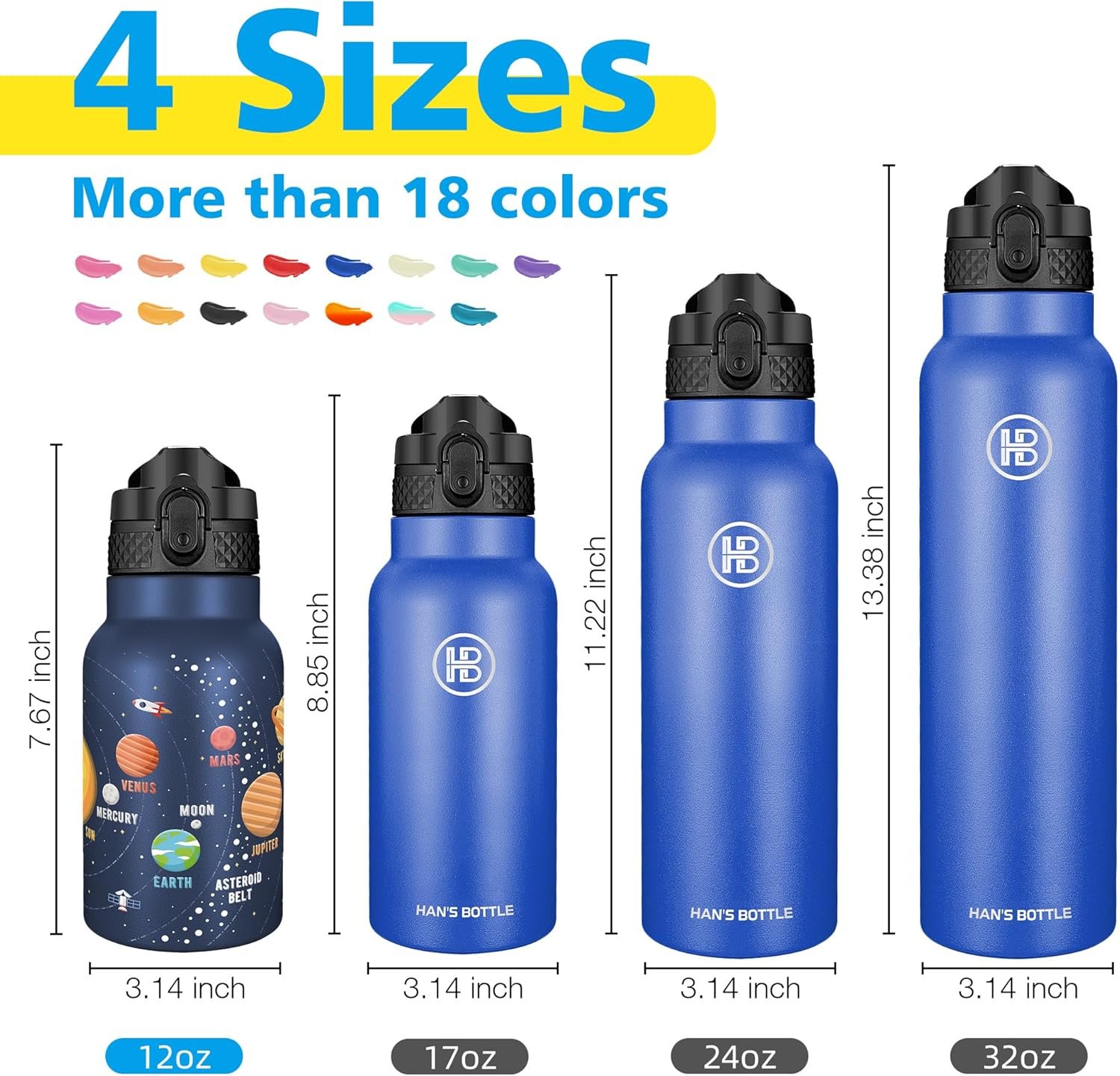 𝐈𝐍𝐒𝐔𝐋𝐀𝐓𝐄𝐃 𝐖𝐀𝐓𝐄𝐑 𝐁𝐎𝐓𝐓𝐋𝐄:The double wall insulation makes the Han’s Bottle sweet-free.Keep your beverages hot for up to 12 hours and cold for up to 24 hours.Our stainless steel water bottles are leakproof which is the best water bottles for kids for school.