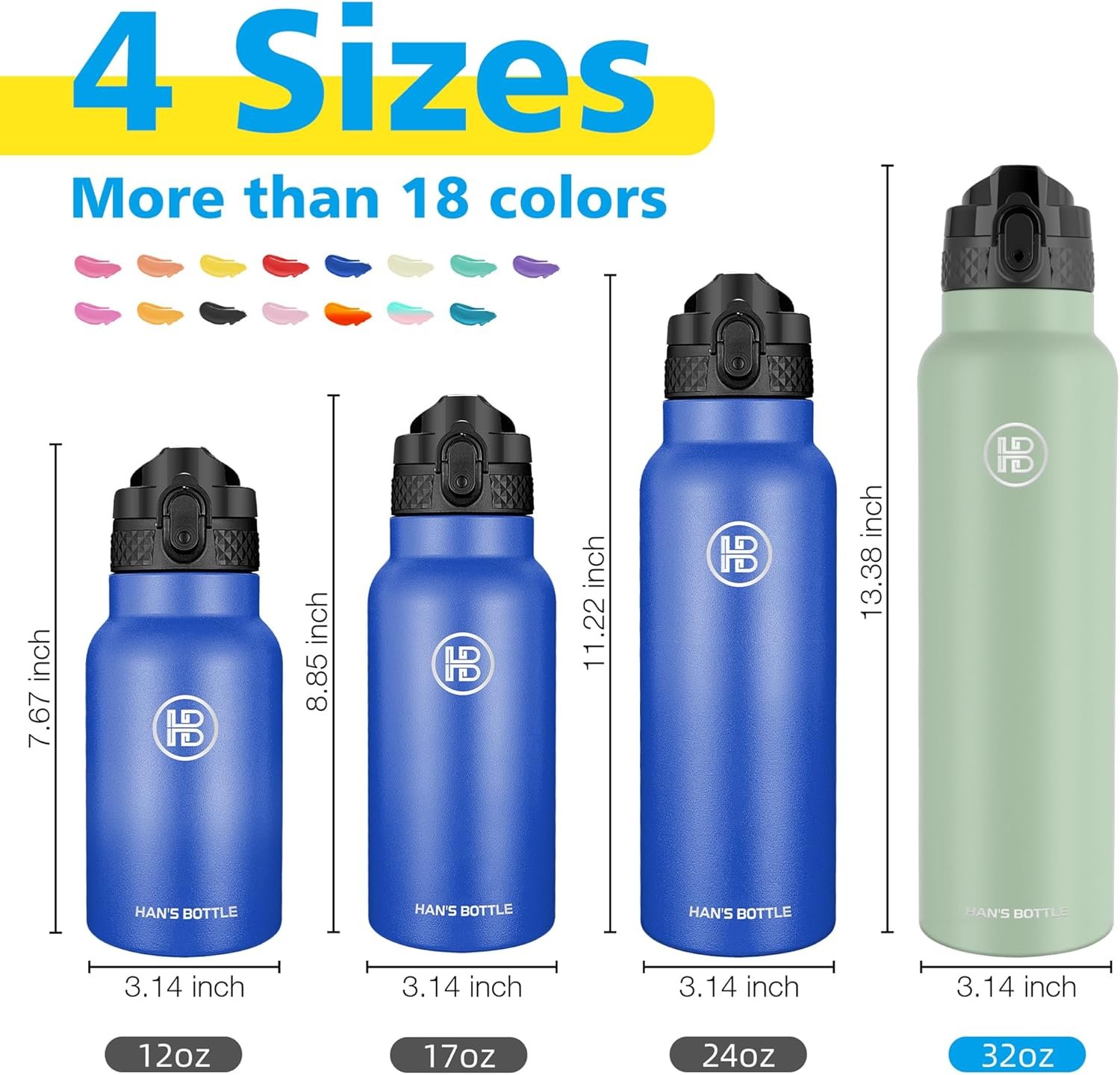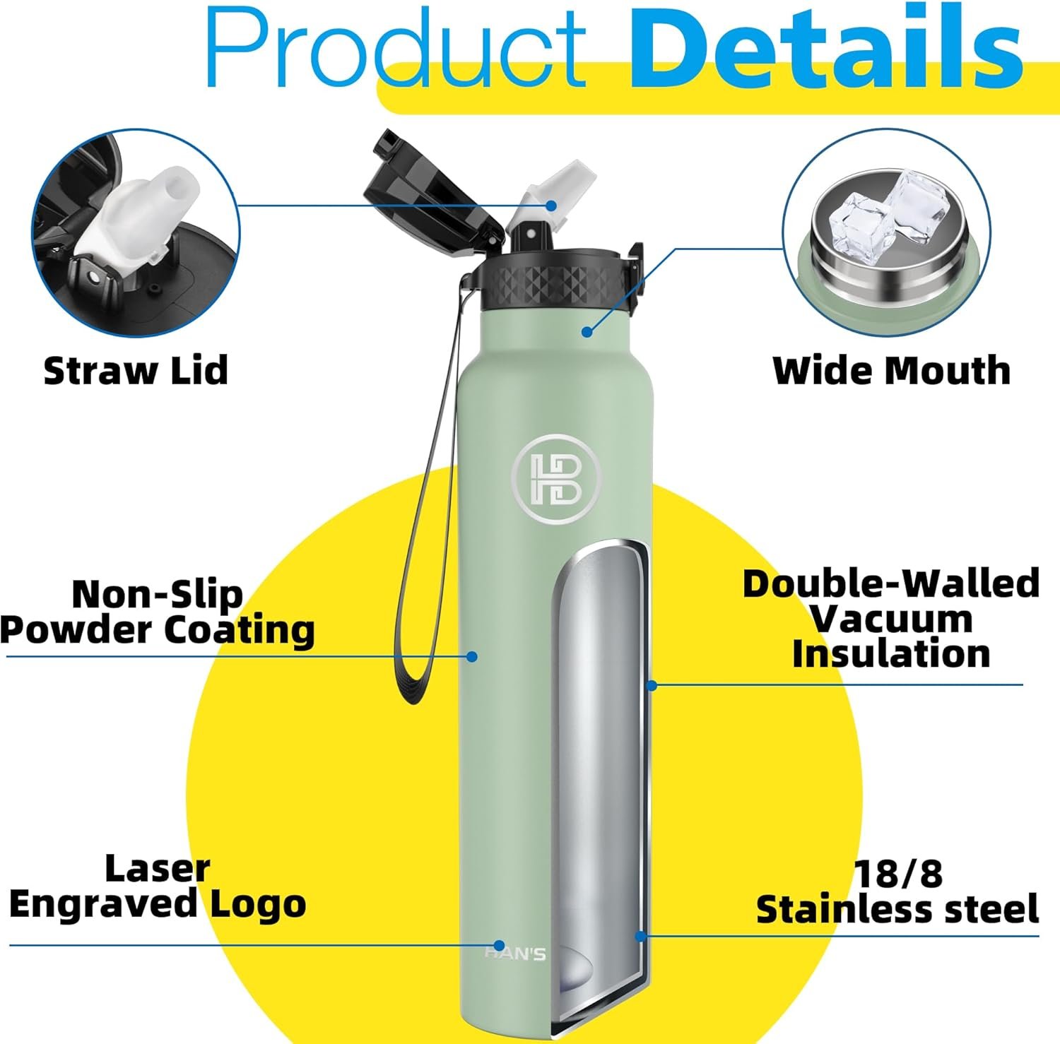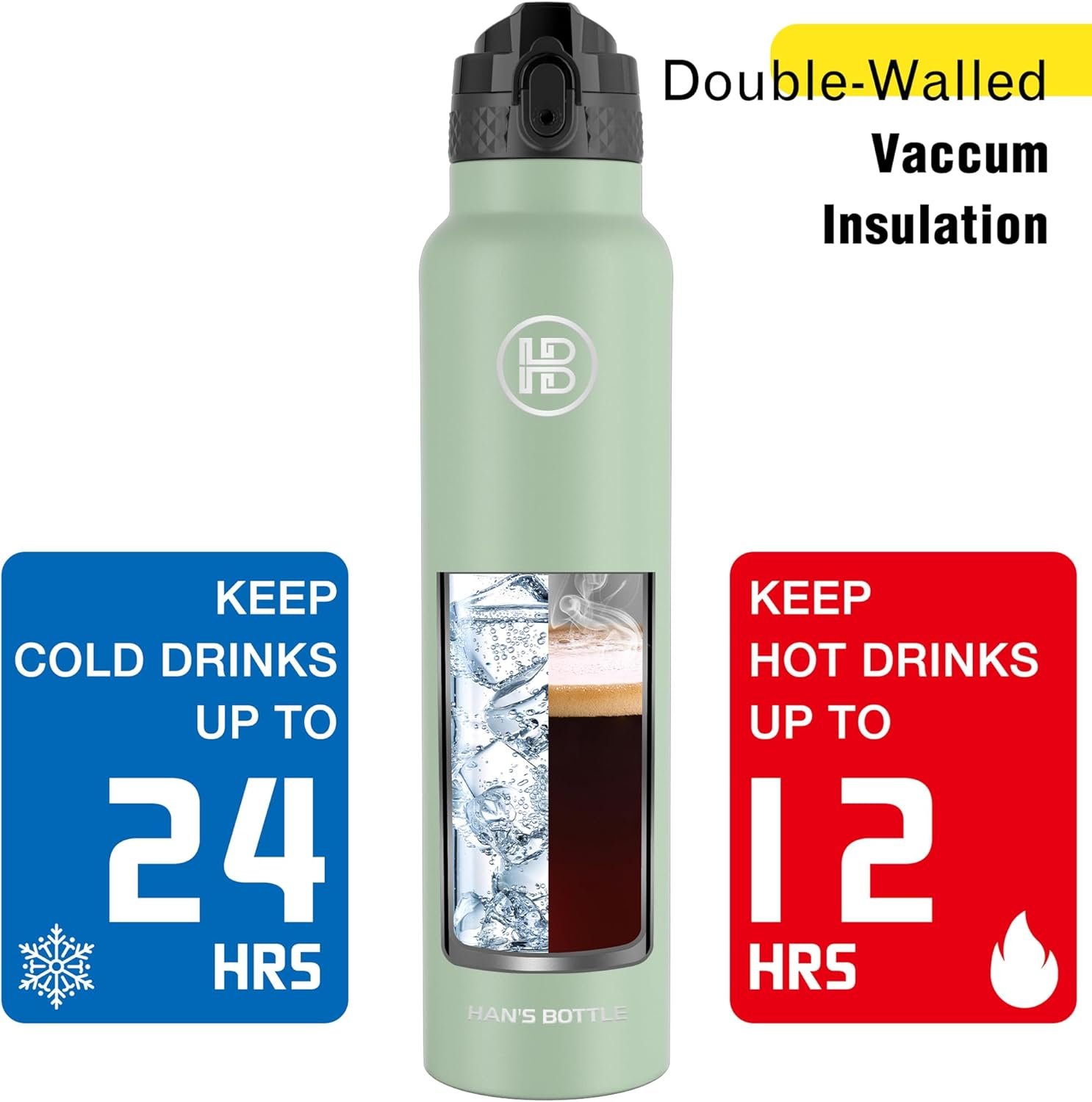INSULATED WATER BOTTLE:The double wall insulation makes the Han’s Bottle sweet-free.Keep your beverages hot for up to 12 hours and cold for up to 24 hours.Our stainless steel water bottles are leakproof which is the best water bottles for mens and womens.