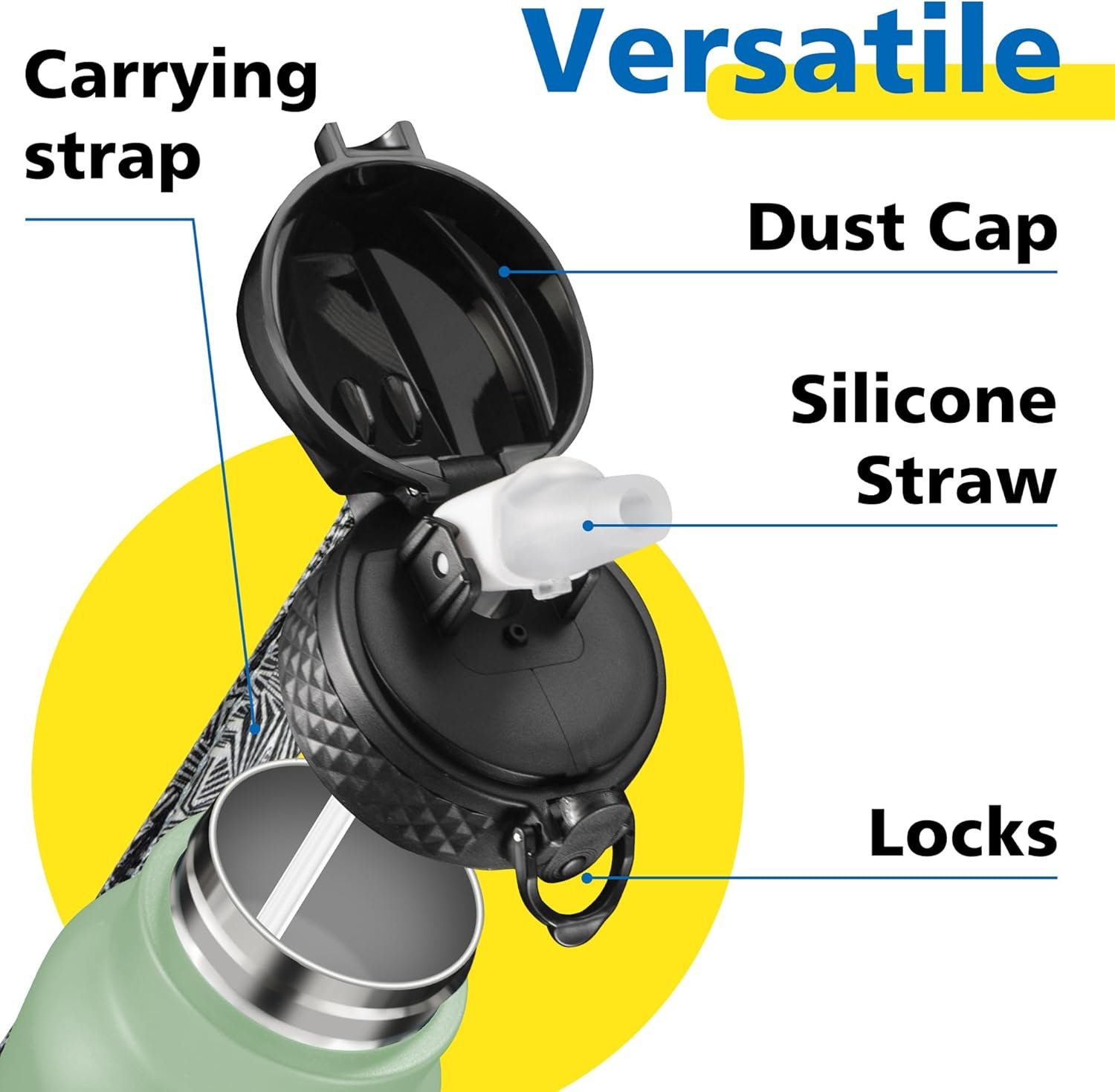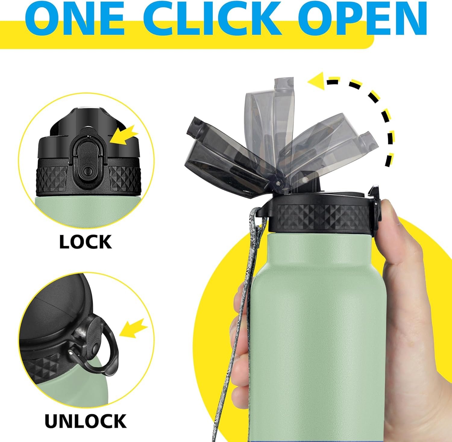 FUNCTIONAL DESIGN: The insulated thermal flask ,water bottle with straw,spill proof flip top lid is designed with a secure lock and sealing ring, ensure water jug dust proof and leak proof. The powder coat exterior finish is scratch resistant,non slip and easy to grap.The water flask 2 inch wide mouth for easy to add ice cubes.This thermal water bottle is dishwasher safe.*NOTE: The lid is hand wash only with soapy hot water.*
