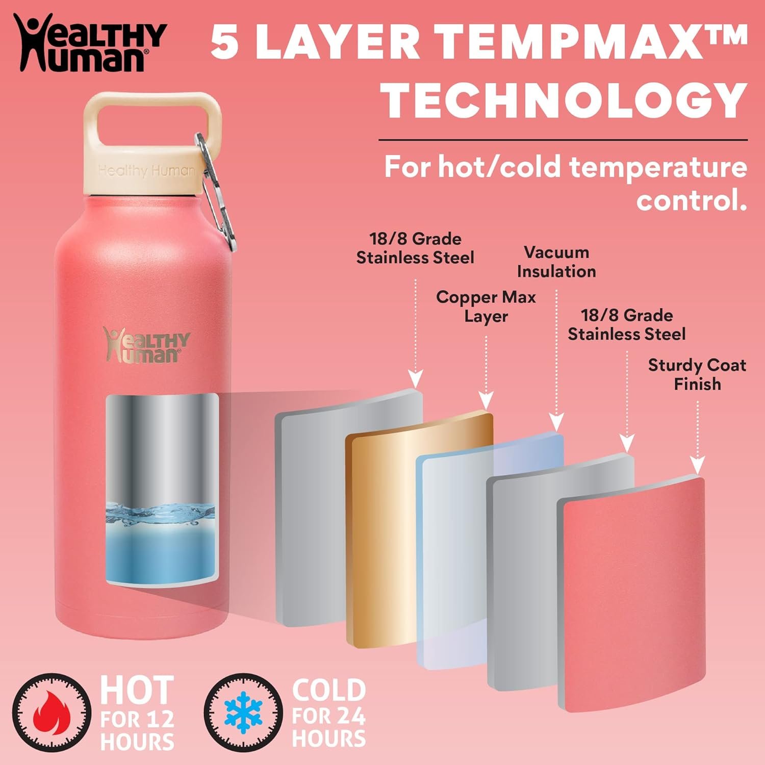 MAXIMUM HOT / COLD TEMPERATURE RETENTION: Using our premium TempMax copper-coated insulation, the advanced Double Wall Vacuum Insulation of the Healthy Human water bottle KEEPS LIQUIDS COLD for 24 hours, HOT for 12 hours, and PIPING HOT for 6 hours.