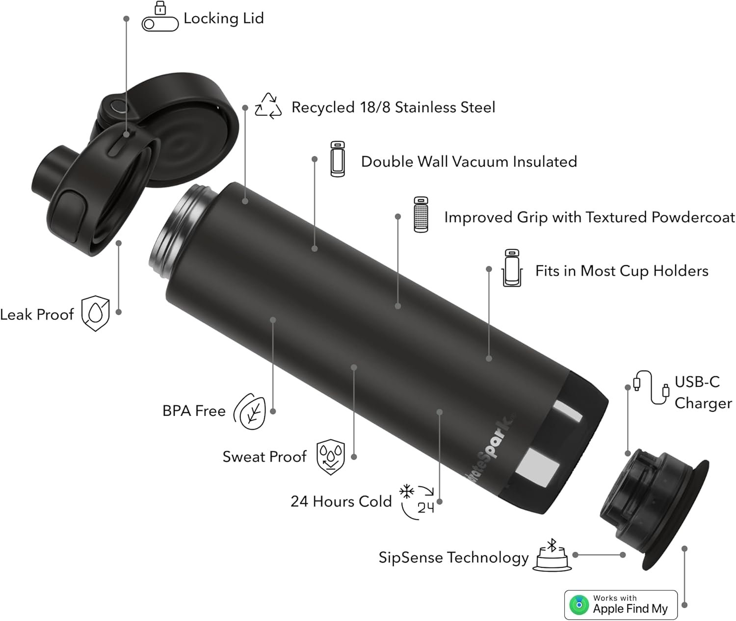 AUTOMATIC HYDRATION TRACKING – SipSense powered sensor uses advanced weight sensing to track every sip and syncs to the app to count toward your daily hydration goal. USB-C rechargeable with up to 21 days of battery life per charge.