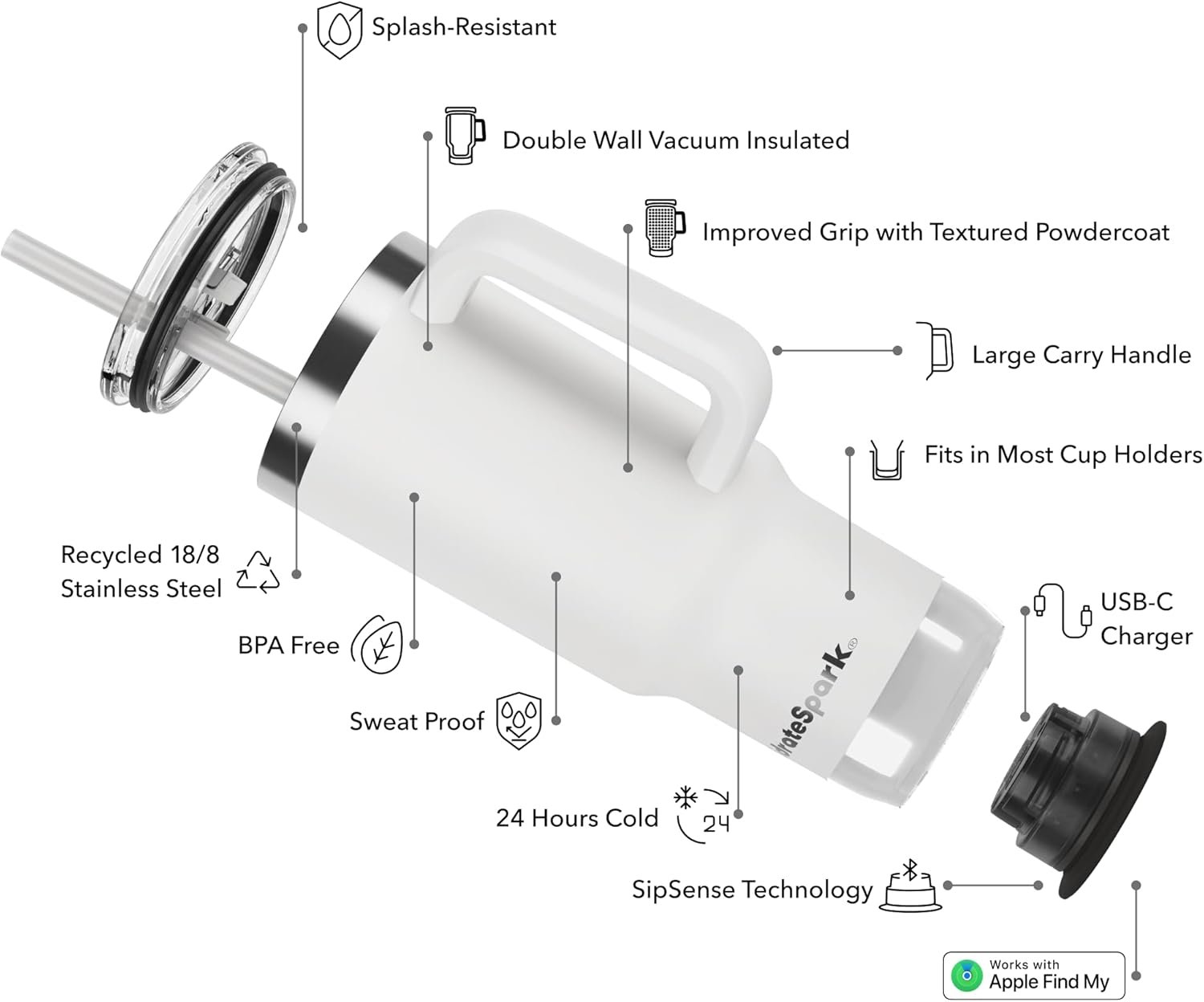 AUTOMATIC HYDRATION TRACKING – SipSense powered sensor uses advanced weight sensing to track every sip and syncs to the app to count toward your daily hydration goal. USB-C rechargeable with up to 21 days of battery life per charge.