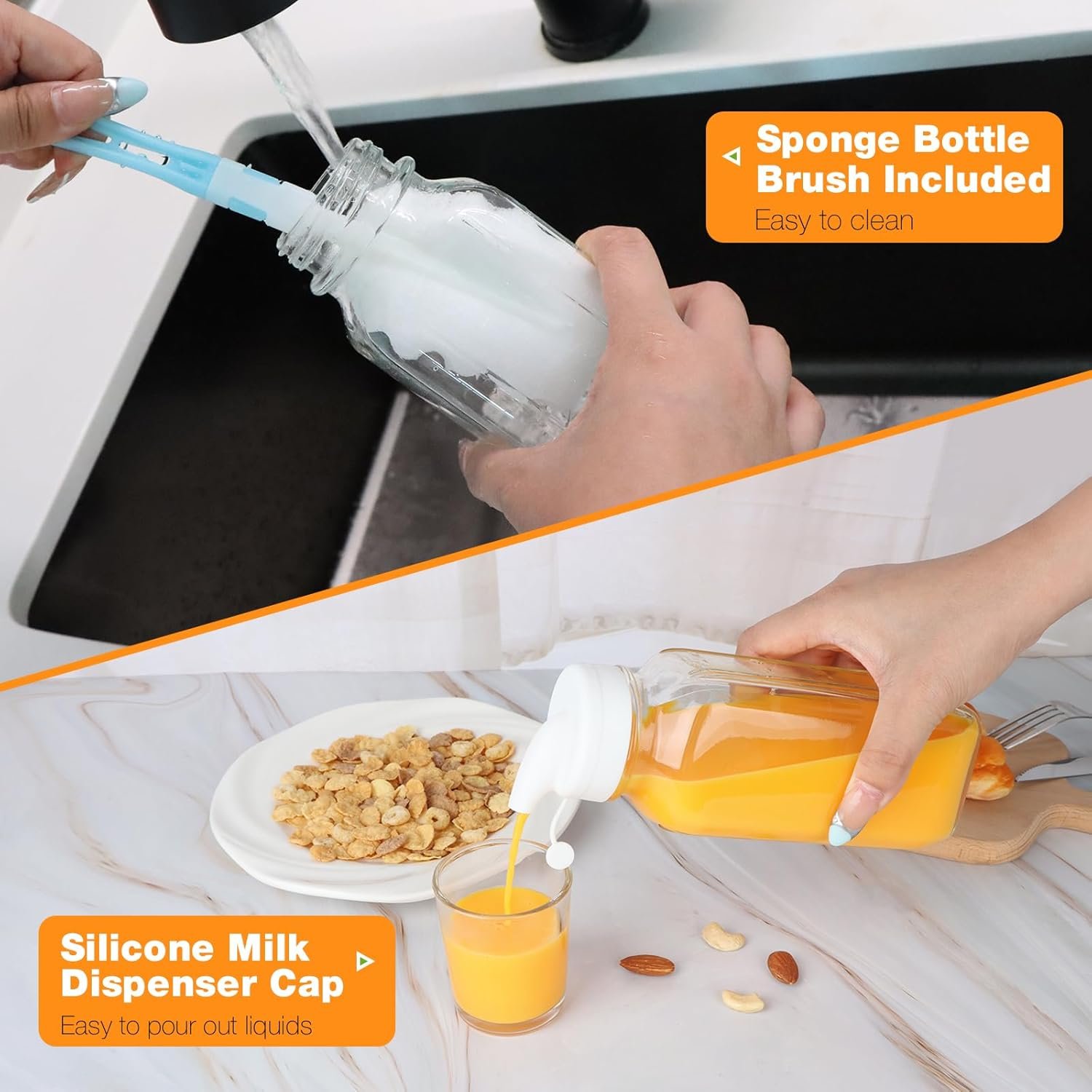 Secure Seal & Easy-Pour Spouts: Each juice jar features an airtight screw lid with a removable silicone gasket, preventing leaks during transport while keeping liquids fresh. Plus, the set includes 2 silicone pour spouts, making it convenient for you to control the pouring milk or beverages and minimize splatters