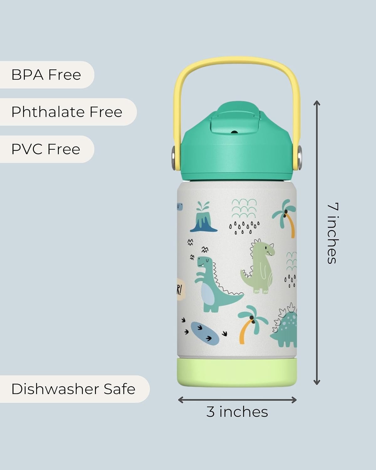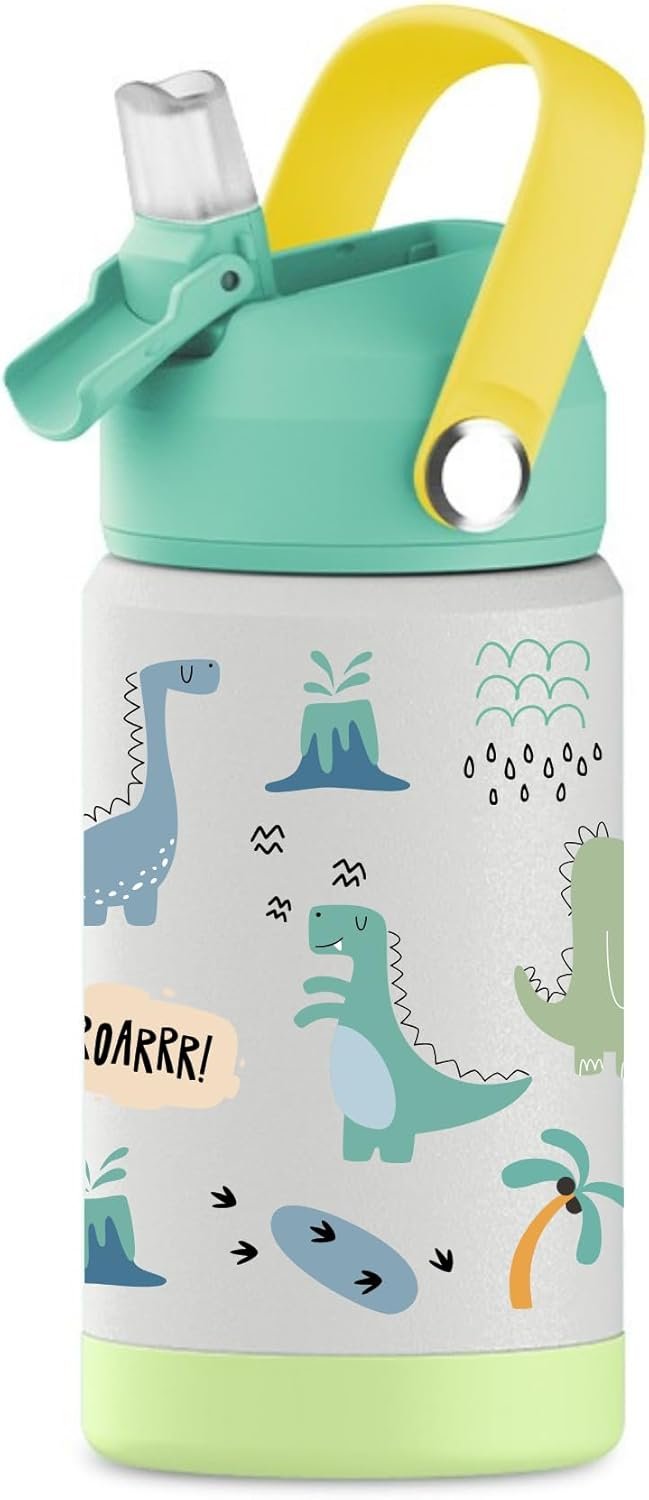 Hippypotamus Kids Water Bottle – Stainless Steel Vacuum Insulated -12 oz – Leak Proof Straw Lid & Soft Spout For Toddlers & Kids (Green Dinosaur)