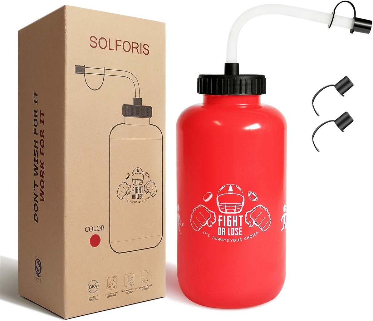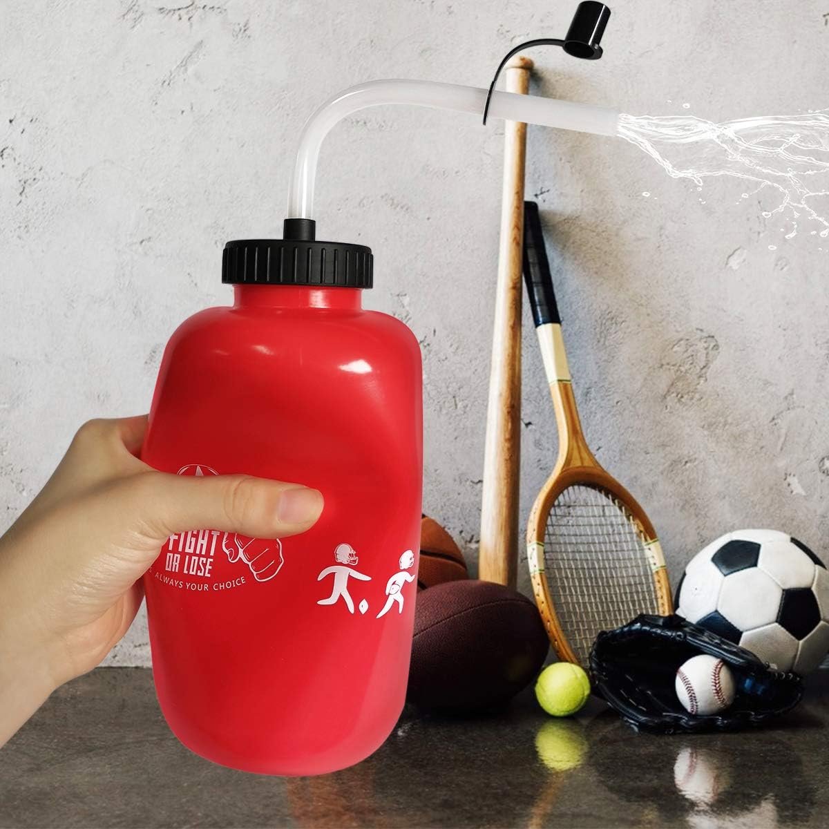Hockey Water Bottles with Long Straw, Fit for Football Lacrosse Gym Sport, Plastic Squeezable Leakproof BPA Free, No Strange Smell, Easy to Clean, 1 Liter 32 oz (3 Straw Caps) (red)