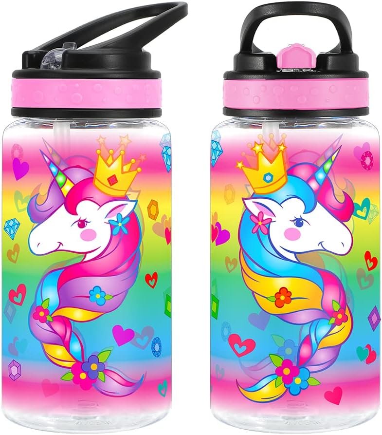 Home Tune 15oz Water Bottle for Kids Girls Boys School, BPA Free, Leak Proof Flip Straw, Carry Loop, Easy Clean – Unicorn