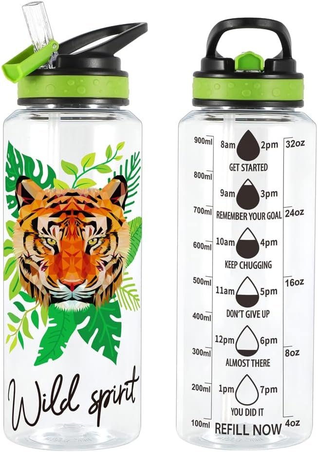 Home Tune 32oz Water Drinking Bottle – Tritan BPA Free, Wide Mouth, Straw Flip Lid, Easy Open, Lightweight, Leak-Proof Water Bottle with Foil Print Design For Girls & Boys – Tiger