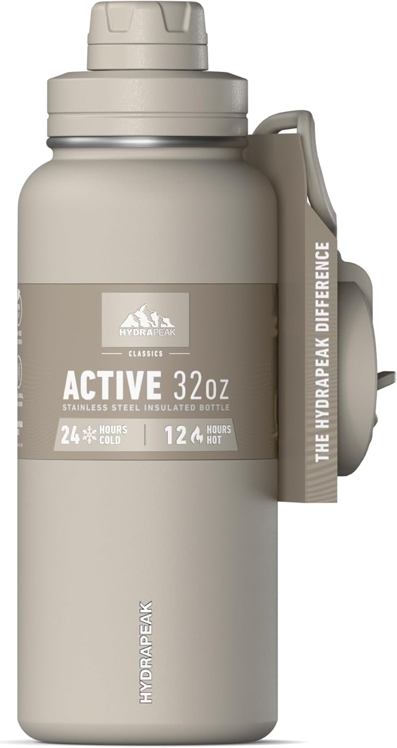 Hydrapeak 32oz Sport Insulated Water Bottle with Straw & Chug Lid, Leak & Spill Proof, Keeps Drinks Cold for 24 Hours, Hot for 12 Hours, Premium Stainless Steel Water Bottles (32oz, Stone)