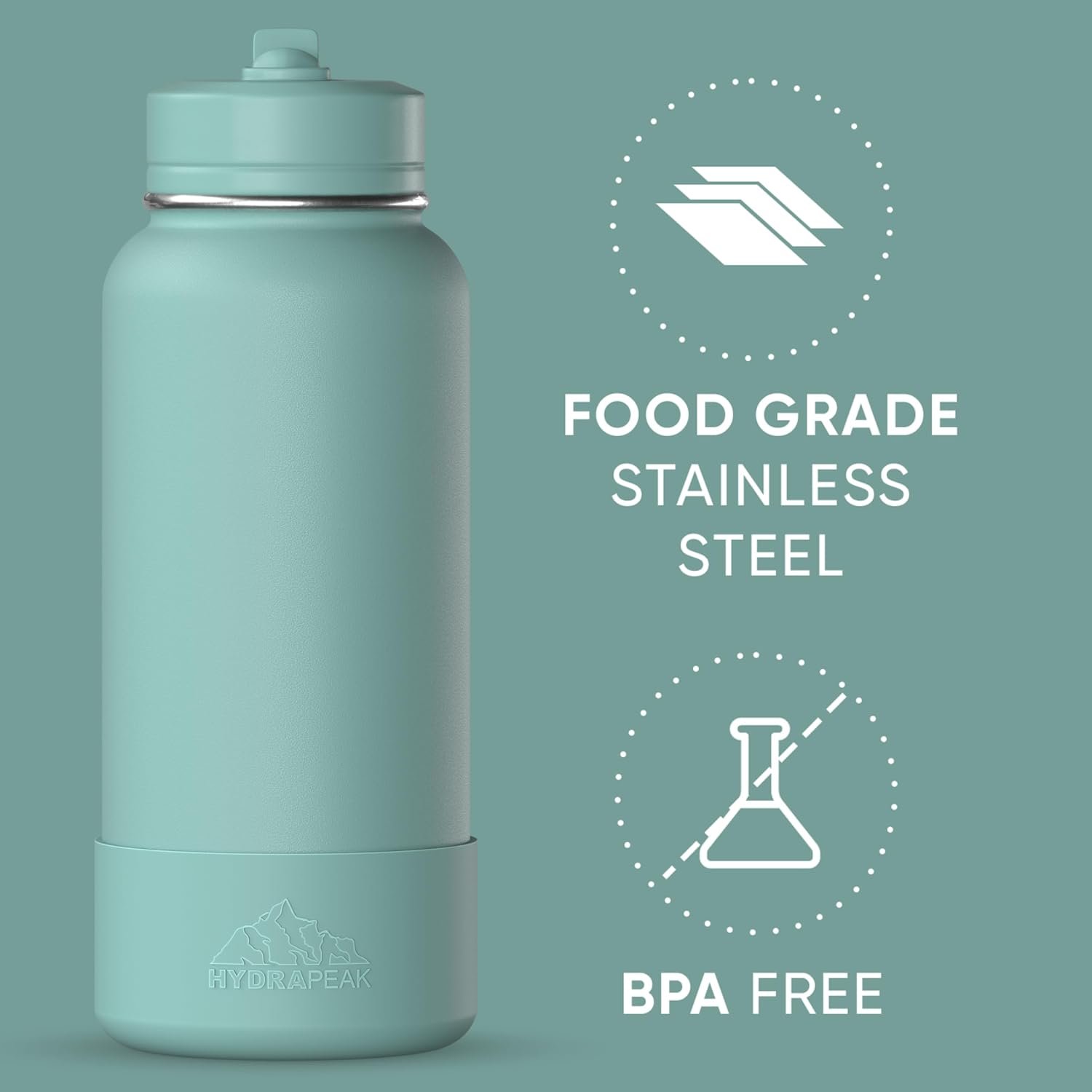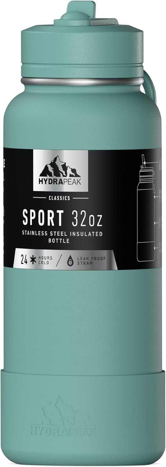 Hydrapeak 32oz Sport Insulated Water Bottle with Straw Lid, Leak & Spill Proof, Keeps Drinks Cold for 24 Hours, Hot for 12 Hours, Premium Stainless Steel Water Bottles (32oz, Pale Sage)