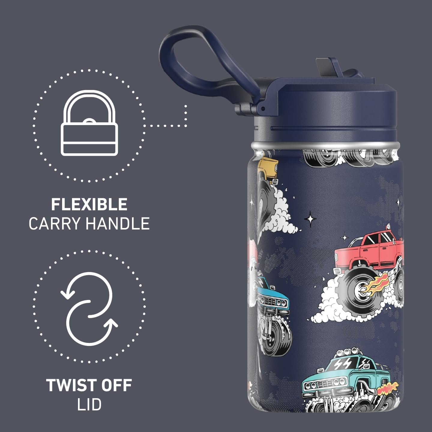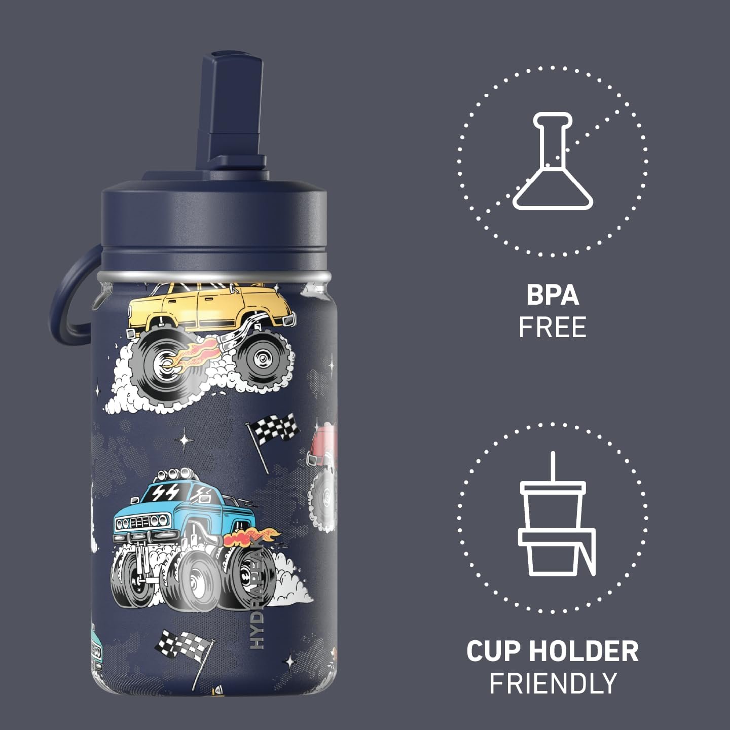 Hydrapeak Mini 14oz Fun Sticker Print Water Bottle with Straw Lid, Stainless Steel Double Wall Insulated Water Bottle, Leak-Proof and Spill-Proof Water Bottle, Monster Truck-Navy