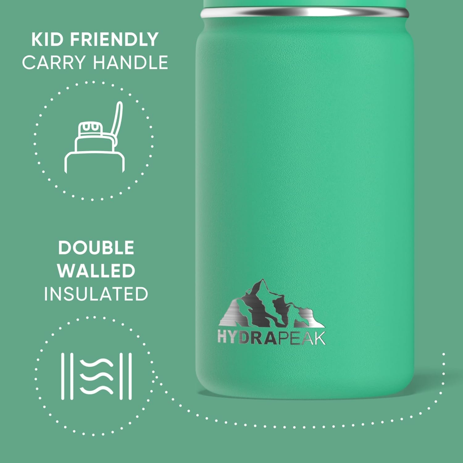 Small enough to fit in a lunch box without taking up too much space. From the classroom to the playground Hydrapeak Mini Kids’ thermos insulated water bottle features a leak-proof lid and integrated carrying handle loop.