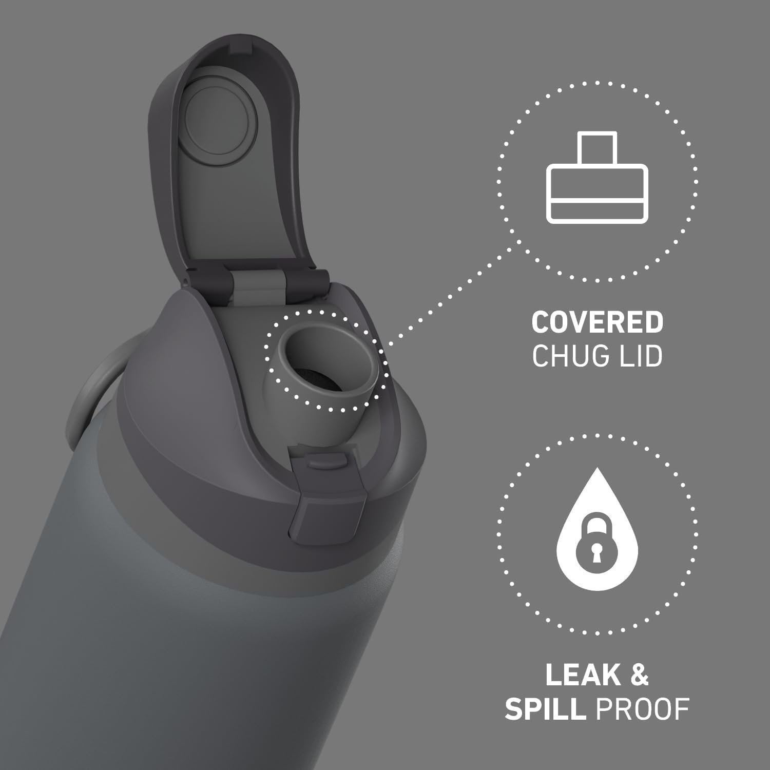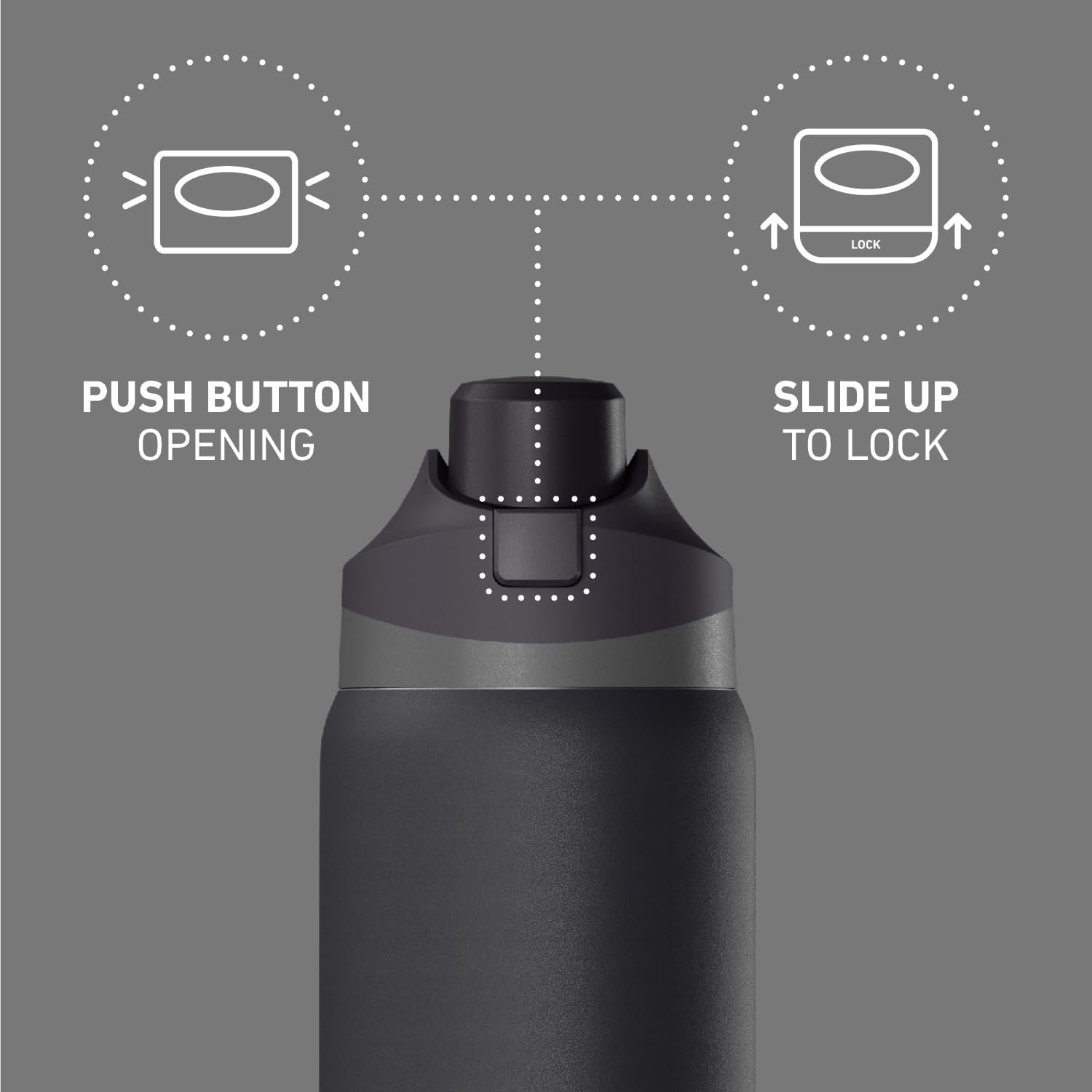 PUSH BUTTON LID: Comes with a leak-proof push button chug lid that keep the spout clean. It also has an integrated grab and go handle for easy carrying.