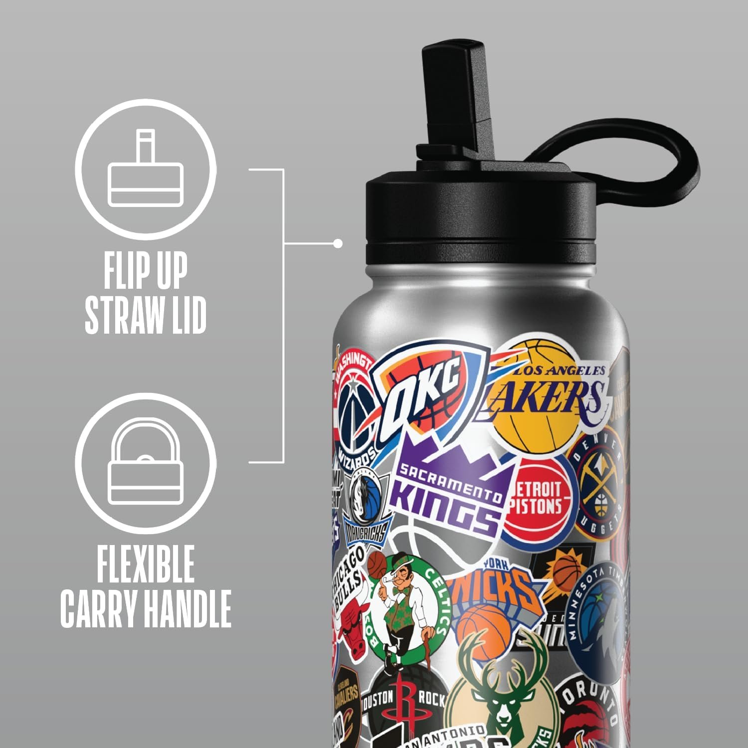 Hydrapeak x NBA Officially Licensed All Team Sticker Print 32 oz Insulated Water Bottle with Straw Lid and Handle