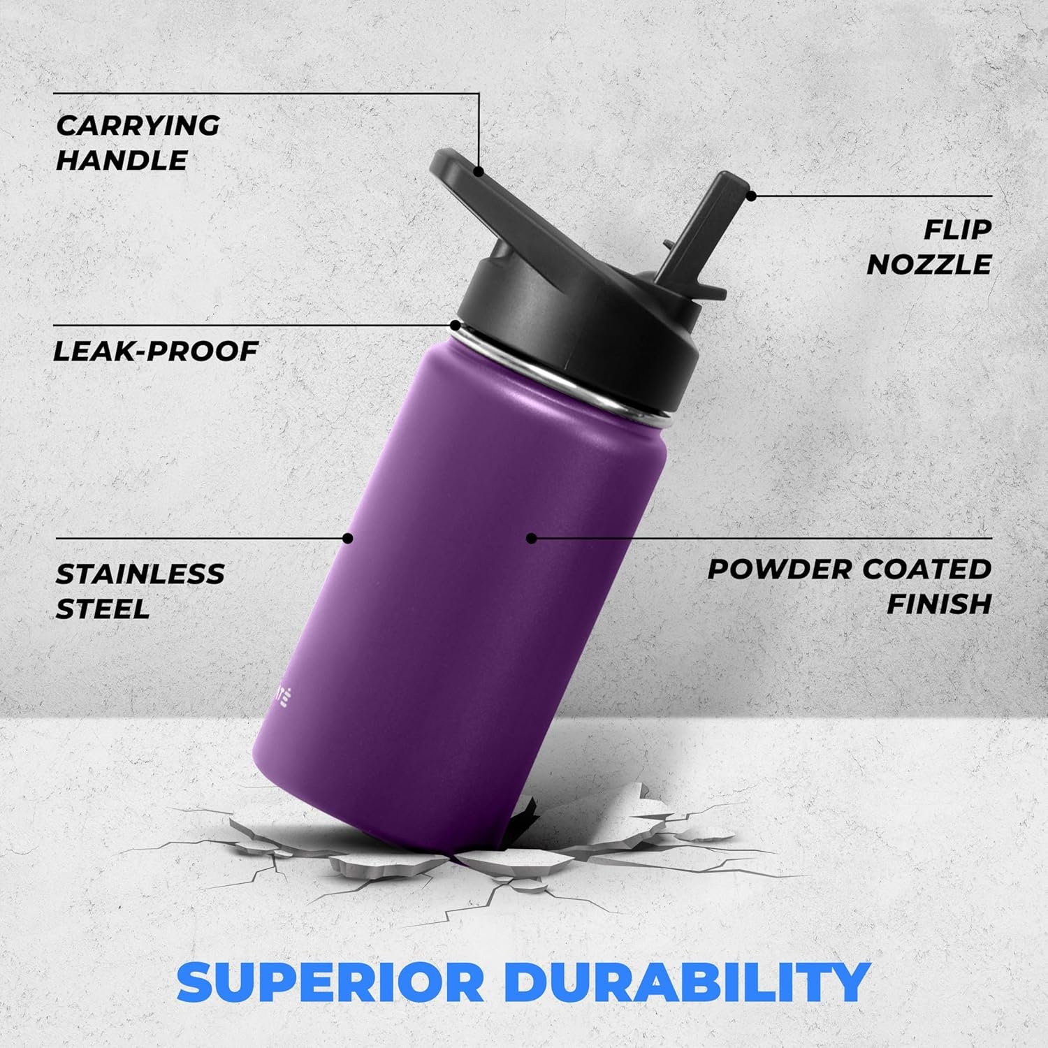 Hydrate Kids Water Bottle – 14oz Insulated Thermal Tumbler with Leak-Proof Folding Straw Lid – Keeps Drinks Cold or Warm for 6–12 Hours – Durable, BPA-Free – Easy Carry – Dark Purple