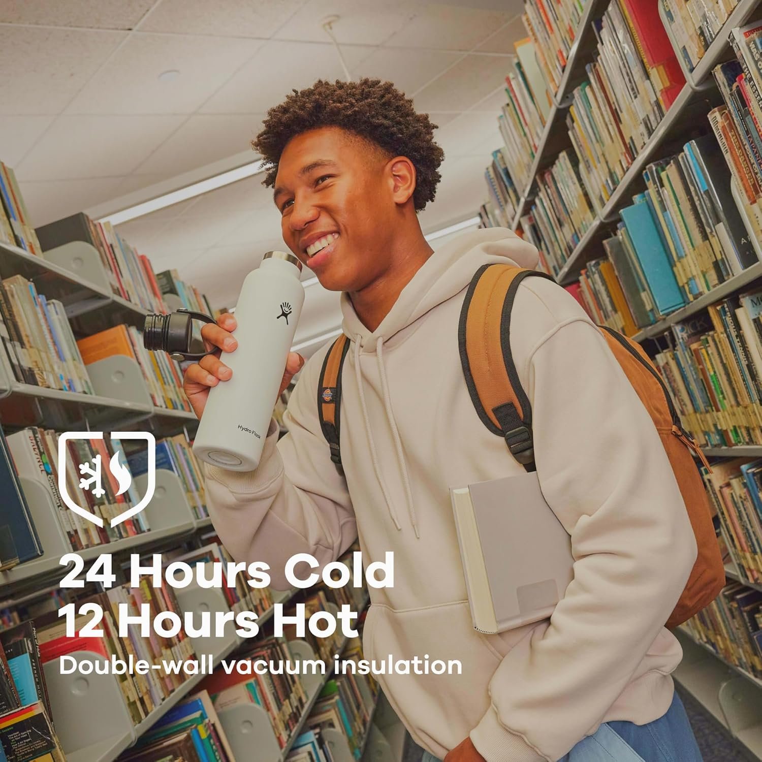 Stay hydrated with the Hydro Flask 21 oz Standard Mouth Bottle. With a comfortable, flexible handle, the reusable water bottle is leakproof with double-wall insulation to keep drinks cold up to 24 hours and hot for up to 12 hours. The insulated bottle easily fits ice cubes and is dishwasher safe. 24 hours cold. 12 hours hot. TempShield® double-wall vacuum insulation. Leakproof when closed. Won’t retain odor or leftover flavor. BPA-Free. Dishwasher safe. Easy to clean by hand or dishwasher. Stays clean and colorful. Not for use on a stove, in a microwave or freezer. Keep hot drinks out of the reach of children. Bottle fits all Standard Mouth caps and lids, including the leakproof Flex Straw Cap.
