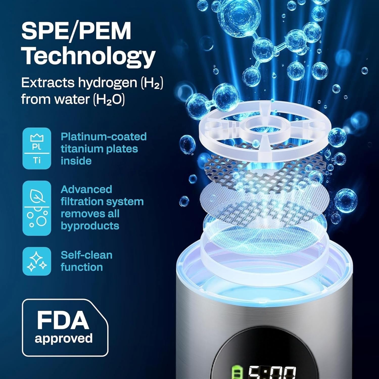 CUTTING-EDGE HYDROGEN TECHNOLOGY: Most efficient hydrogen water bottle with advanced SPE/PEM technology The innovative filtration system ensures up to 6000 PPB hydrogen concentration, removing harmful byproducts to preserve the purity of your water.