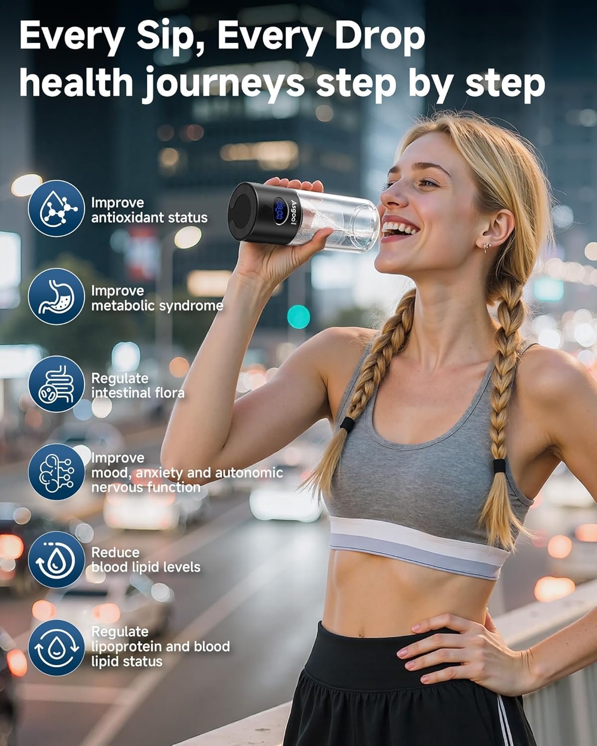 Our Hydrogen water bottle uses advanced SPE/PEM technology to release abundant hydrogen molecules in water. Scientific studies have shown that hydrogen molecules have powerful antioxidant capabilities and help neutralize free radicals, thereby protecting your cells from damage.