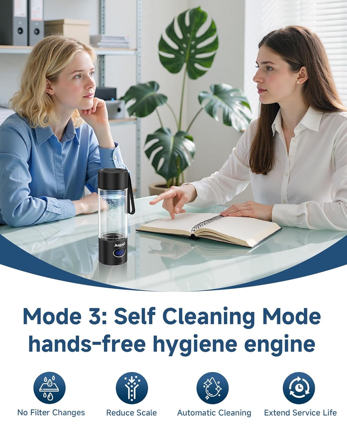 Innovative Hydrogen Production Modes – Equipped with three modes: Single Production Mode – 8 minutes of high-concentration hydrogen generation; Auto-Refresh Mode – 5 minutes initial hydrogen production, then run 2 minutes every 30 minutes for up to 8 hours; Self-Cleaning Mode – 30-minute deep clean for optimal hygiene