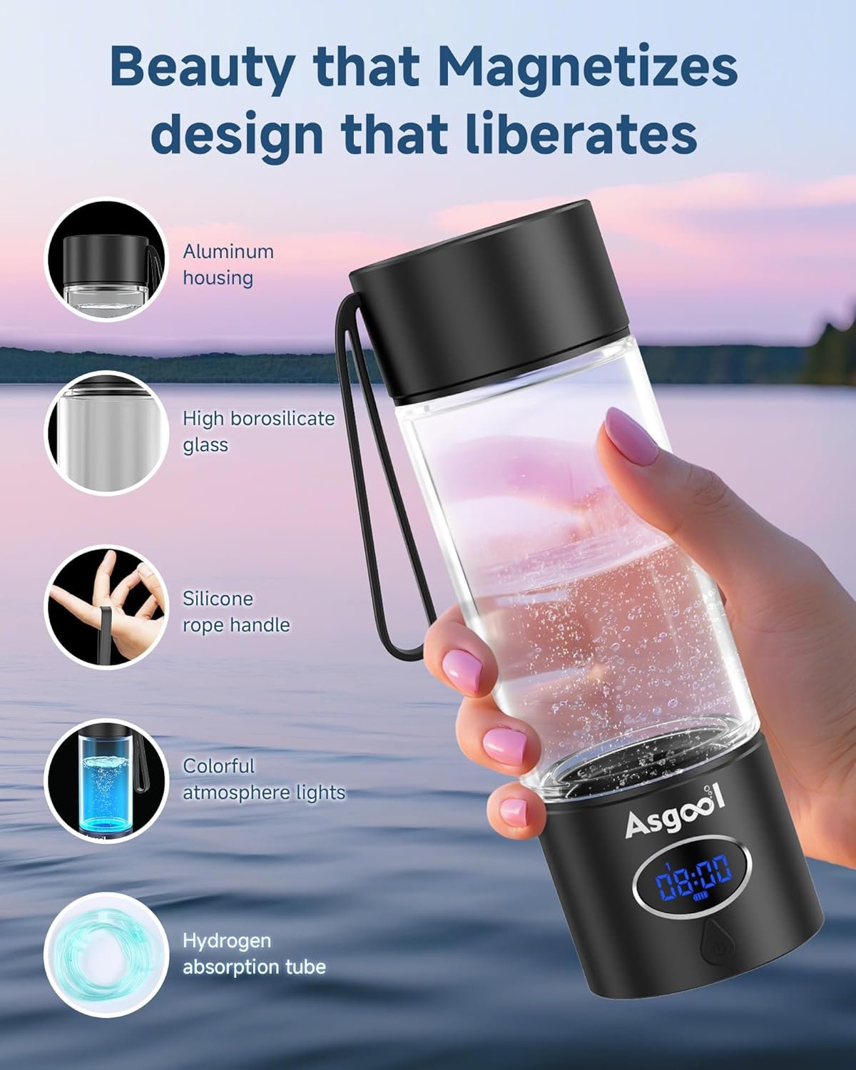 Premium Quality & Safety: Crafted with a glass exterior and aluminum alloy shell, our hydrogen water bottle features a stainless steel and food-grade silicone interior for exceptional durability and leak-proof performance. Comes with a silicone lanyard for effortless portability – perfect for home, office, or travel hydration.
