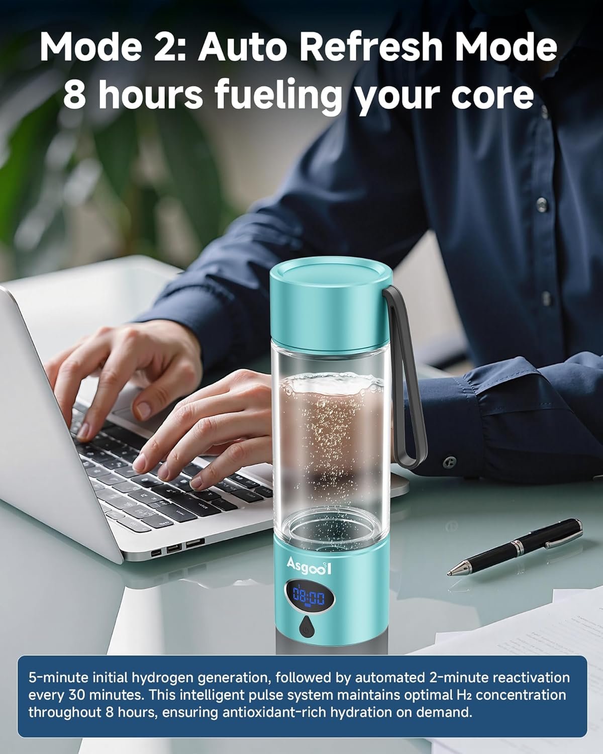 Hydrogen Water Bottle – 5000 PPB in 8 Minutes, Cyclic Mode for 8 Hours, Self Clean, Aluminum & Glass, 360ml Capacity, for Travel, Sports, Office, Home (CyanBlue, 12Oz)