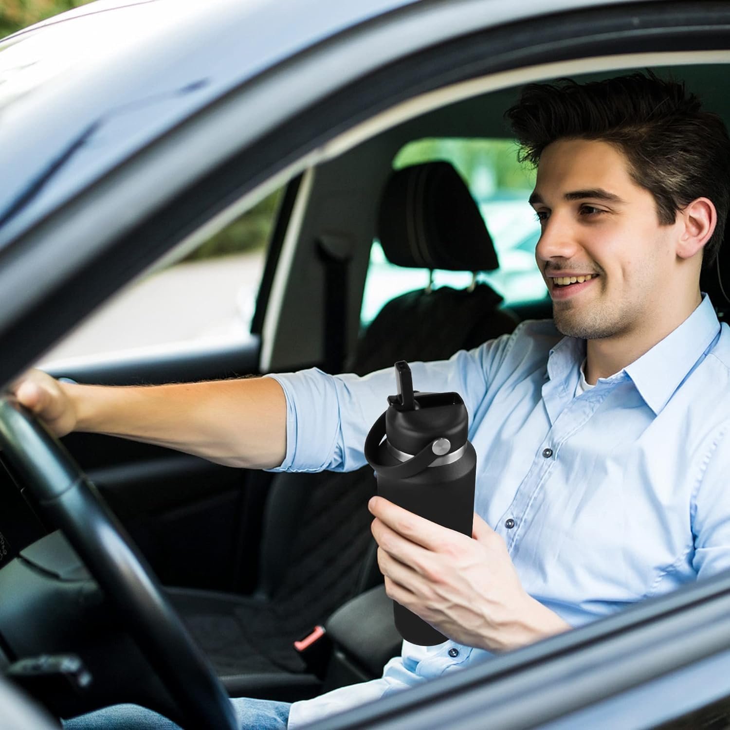 It is the largest volume insualted wide mouth water bottle which can fit any standard car cupholder,when we are outside or driving no need to stop and keep adding water, Which can meet our daily drinking needs and the straw lid is perfect use for drinking by one hand.