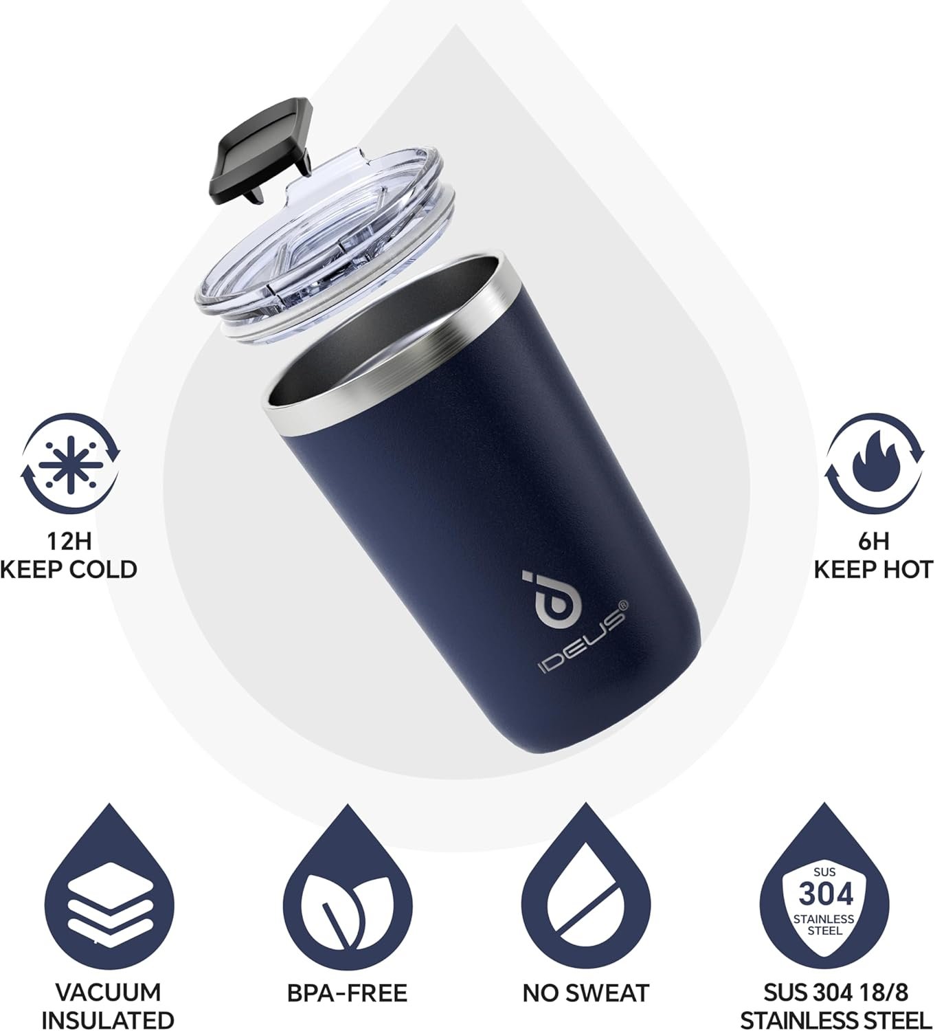 【Vacuum Insulation】- IDEUS 20oz coffee tumbler is made from 18/8 stainless steel. Advanced double-wall vacuum insulation technology can keep the temperature of beverages for up to 6 hours (hot) & 12 hours (cold).