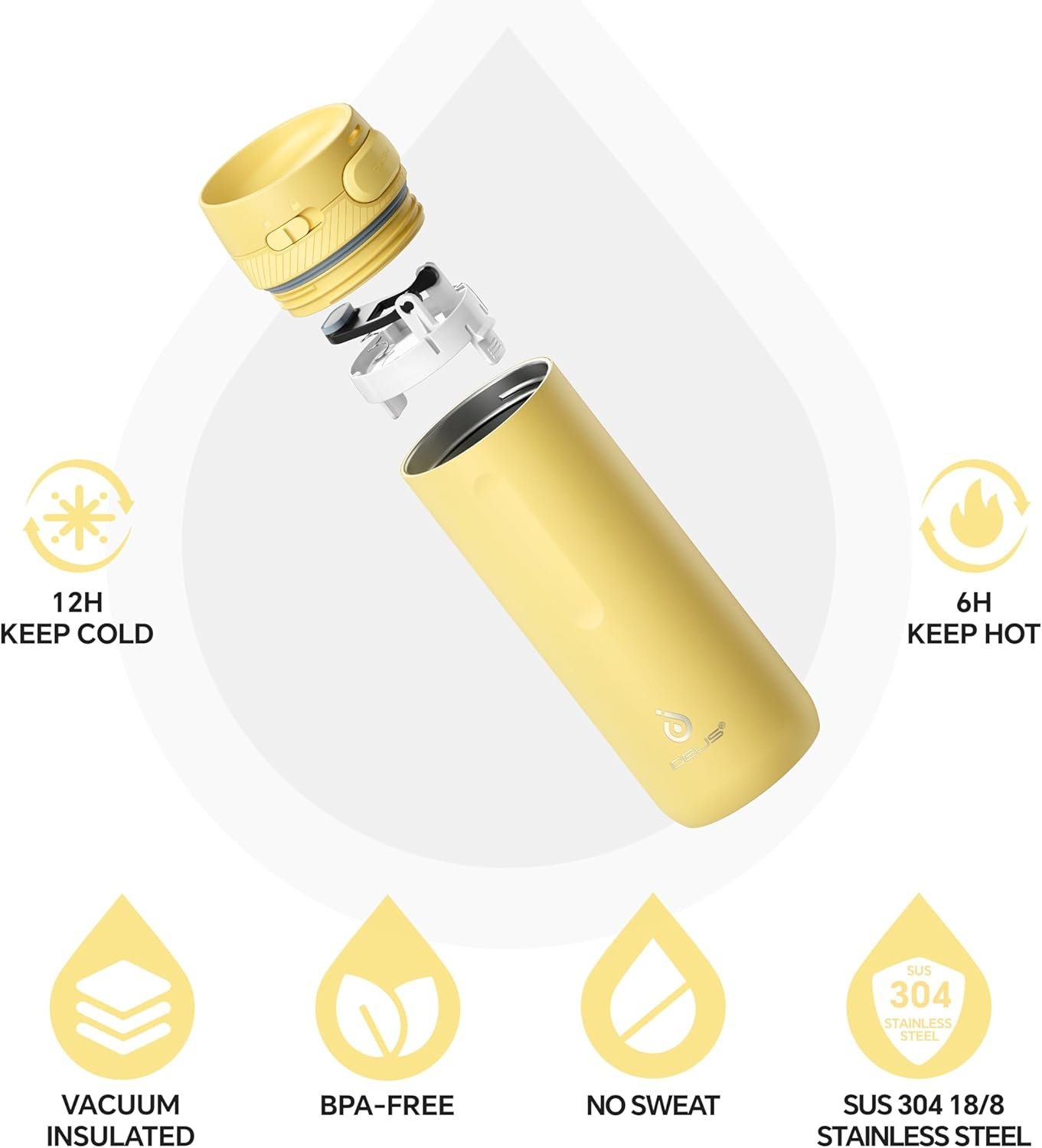 IDEUS Insulated Stainless Steel Water Bottle 17 oz Push Button Lid & Leakproof Travel Mug for Hot/Cold Beverages Fits Most Cup Holder (Light Yellow)