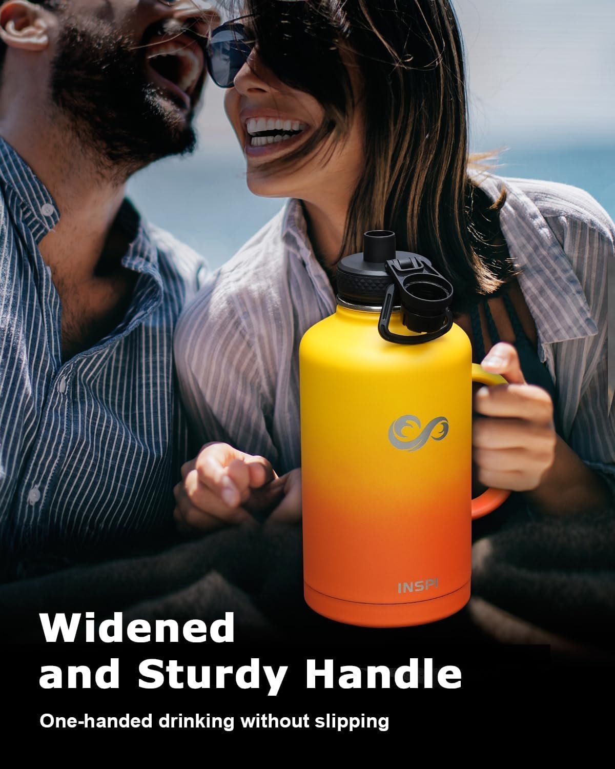 INSPI Half Gallon Water Bottle with Handle, 64oz Insulated Water Bottle with Straw & 2 Lids, Double Wall Stainless Steel Large Jug Travel Flask for School, Hiking & Camping, 100% Leak Proof, Orange