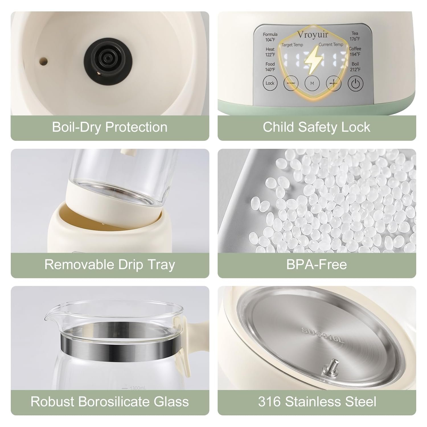 Vroyuir water dispenser is crafted with BPA-free, food-grade, and heat-resistant materials. The inner parts contacting water are made of high borosilicate glass and 304 stainless steel, ensuring heated water remains odor-free and safe for formula preparation.