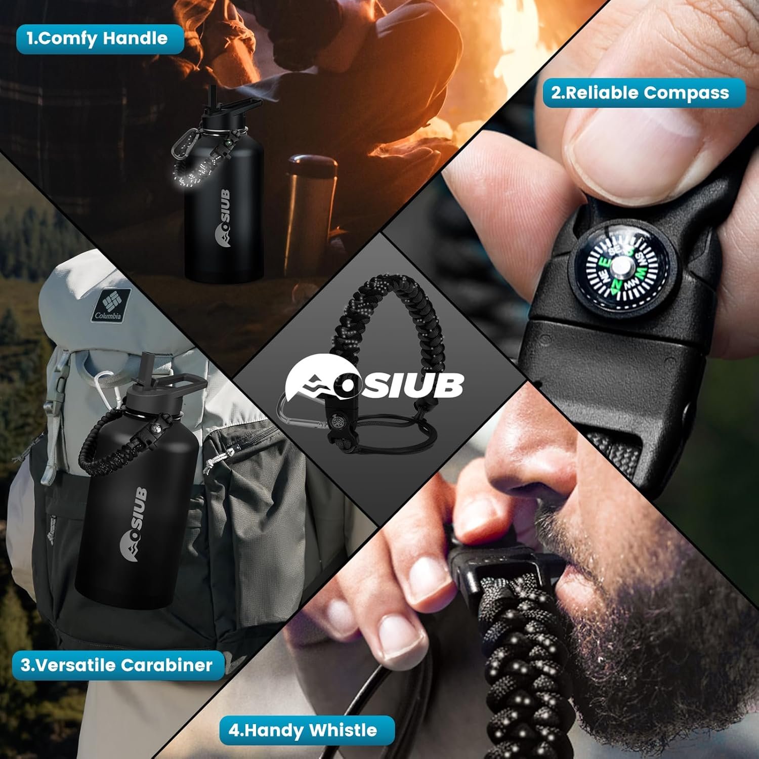 Nighttime Navigation: Not only does the paracord handle securely grip your insulated water bottle, but it also boasts a glow-in-the-dark feature. Complete with a compass and carabiner, this multifunctional paracord handle is an essential companion for your camping or hiking adventures.