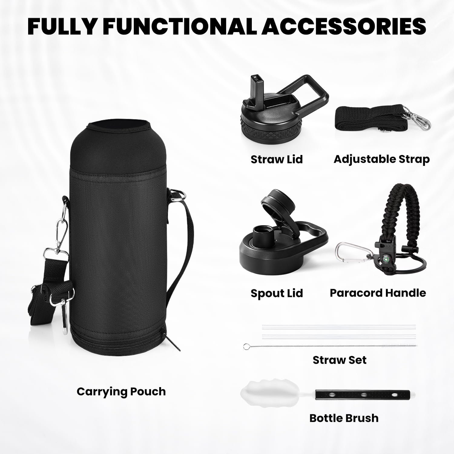 Insulated Water Bottle 32 oz, Triple Wall Vacuum Stainless Steel (Cold for 48 Hrs), Leak Proof & Non-BPA, Modern Water Flask Jug with Paracord Handle & Straw Spout Lids, Magic Black