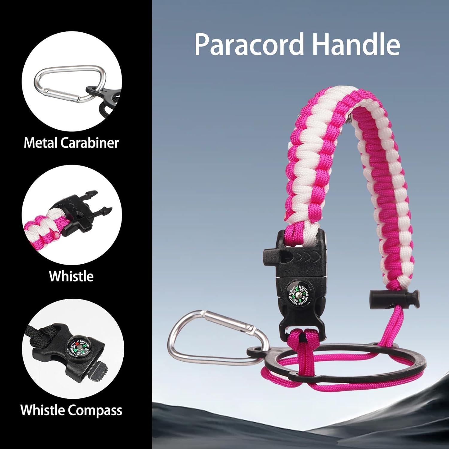Suitable for all occasions: This insulated water bottle comes with a beautiful hand-woven nylon paracord, and the paracord handle is equipped with a compass and carabiner and a whistle. It is a fully functional essential water bottle for camping, climbing, hiking, home use, travel, cycling, swimming fitness, and commuting